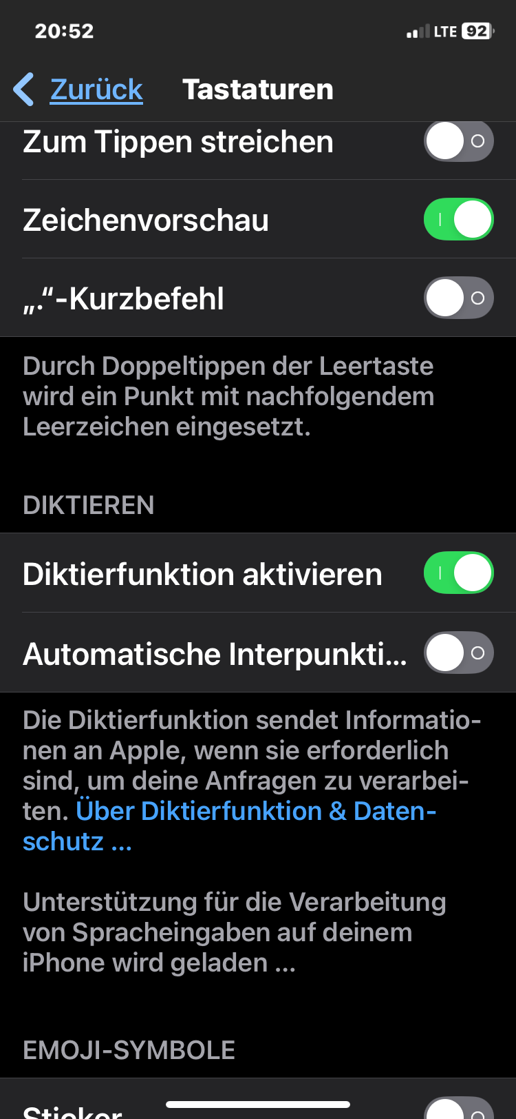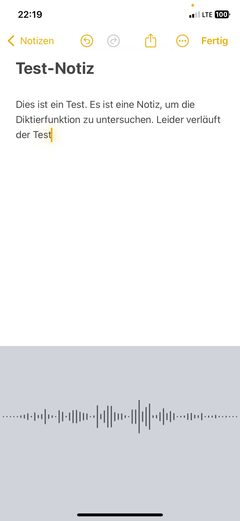 Selbstverständlich habe ich zunächst die Diktierfunktion ein- und ausgeschaltet, später auch ausgeschaltet und das iPhone ebenfalls ausgeschaltet. Nach dem Einschalten habe ich die Diktierfunktion wieder aktiv aktiviert. Keine Veränderung.