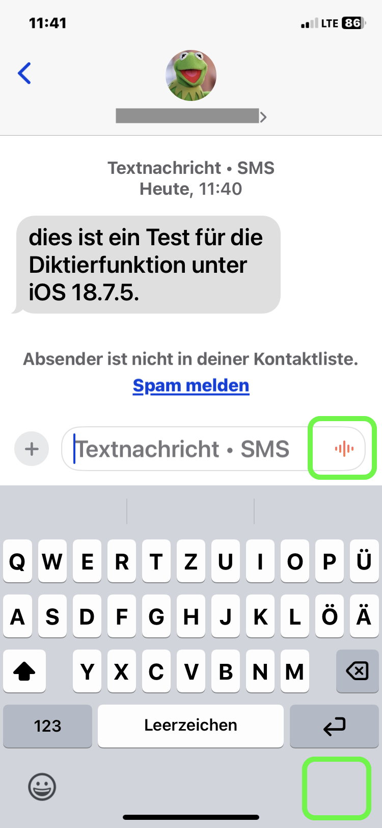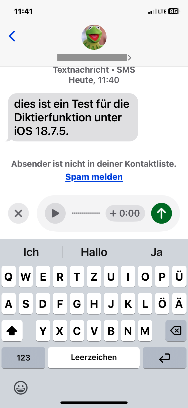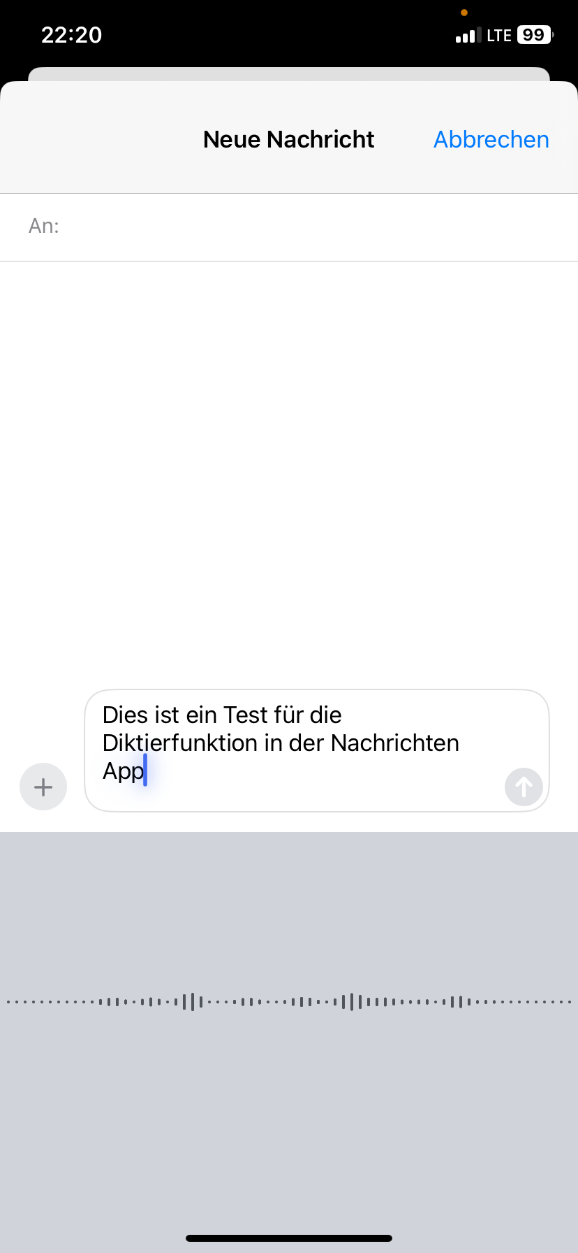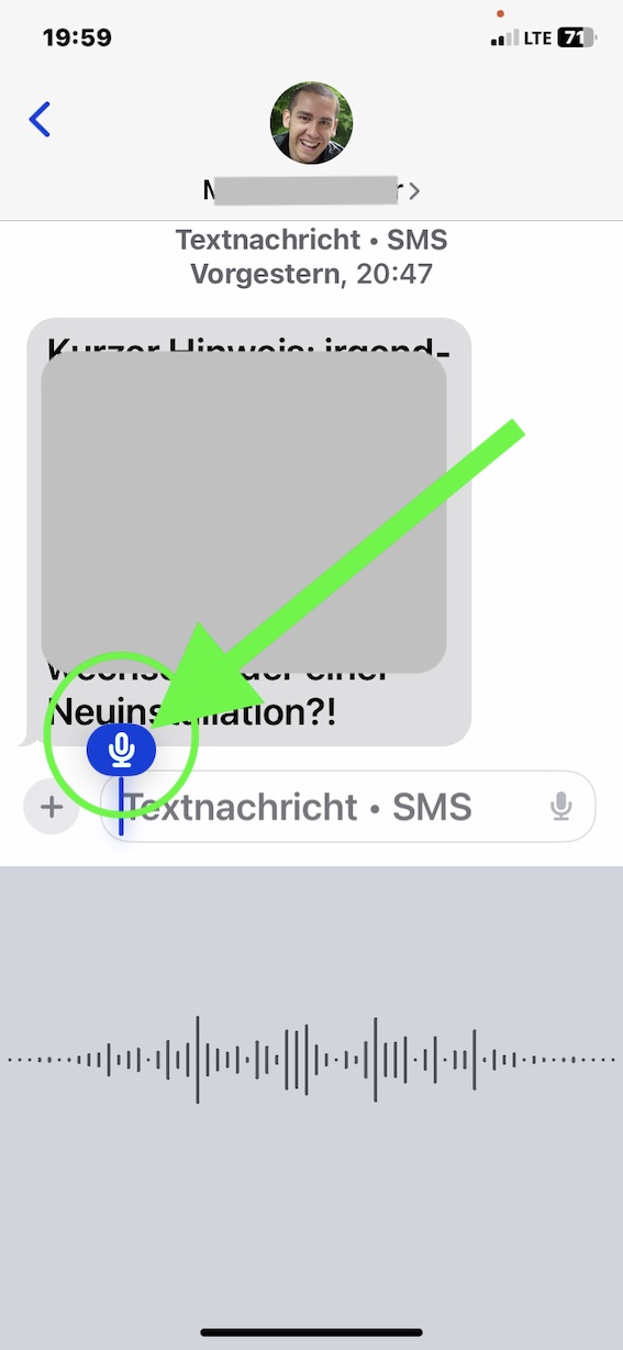 Das neue iPhone XR zeigt hier jedoch ein anderes Verhalten: Wenn ich die Diktierfunktion aktiviere, verschwindet die Bildschirmtastatur und stattdessen wird eine Visualisierung für die gesprochene Stimme angezeigt (siehe Screenshots unten). Dieses Verhalten zeigt sich leider auch in allen anderen Anwendungen, also nicht nur in der Nachrichten-App
