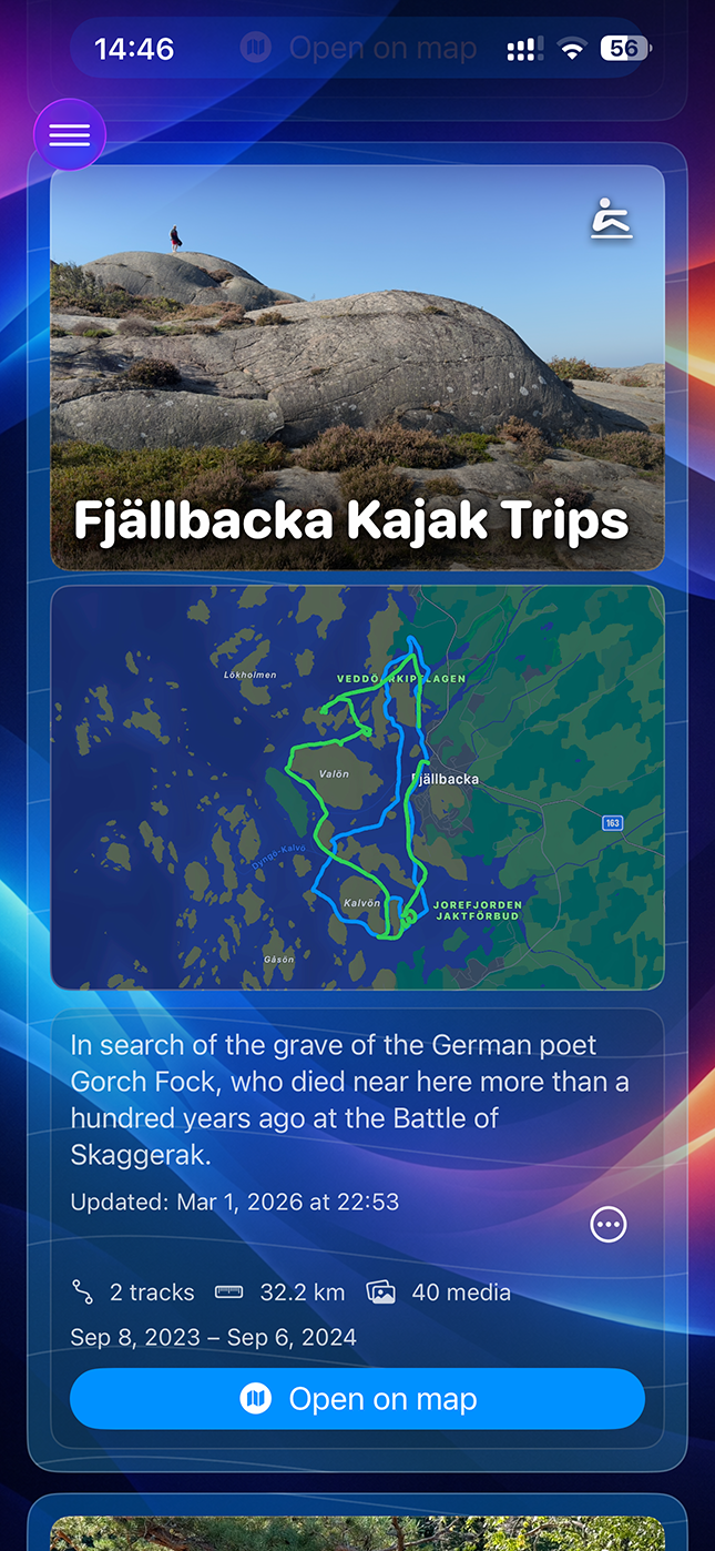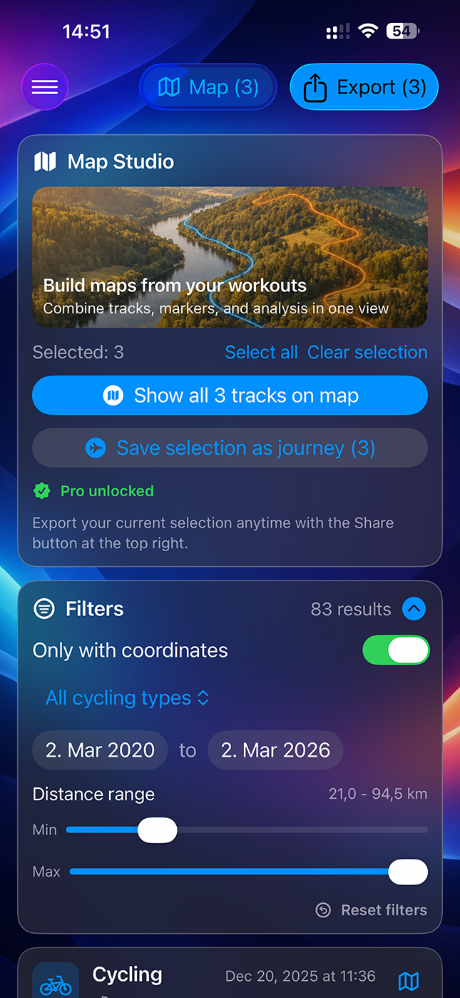 Mehrere Workouts zu einer Journey bündeln – z. B. eine mehrtägige Radtour, eine Paddelreise oder einen Wanderurlaub – und alles als Gesamtstrecke auf einer gemeinsamen Karte sehen.