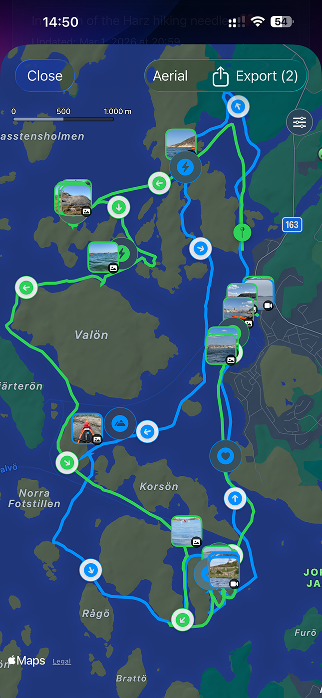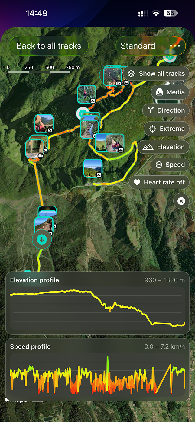 Dazu kommen Fotos und Videos aus dem jeweiligen Zeitraum direkt entlang der Strecke. Man bekommt also einen visuellen Rückblick auf die Tour: Karte, Tracks und Medien in einem Zusammenhang. Also eher Reisetagebuch als Fitness-Tracker. Medien lassen sich auch explizit ein-/ und ausblenden, so dass man am Ende eine schöne Übersicht über seine Touren hat - mit wenig Aufwand. Denn im Grunde läuft der Großteil eh schon nebenher mit der Apple-Watch über HealthKit und über die aufgenommenen Fotos und Videos. Alternativ kann man aber auch GPX-Daten importieren um Tracks nachträglich zu füllen.