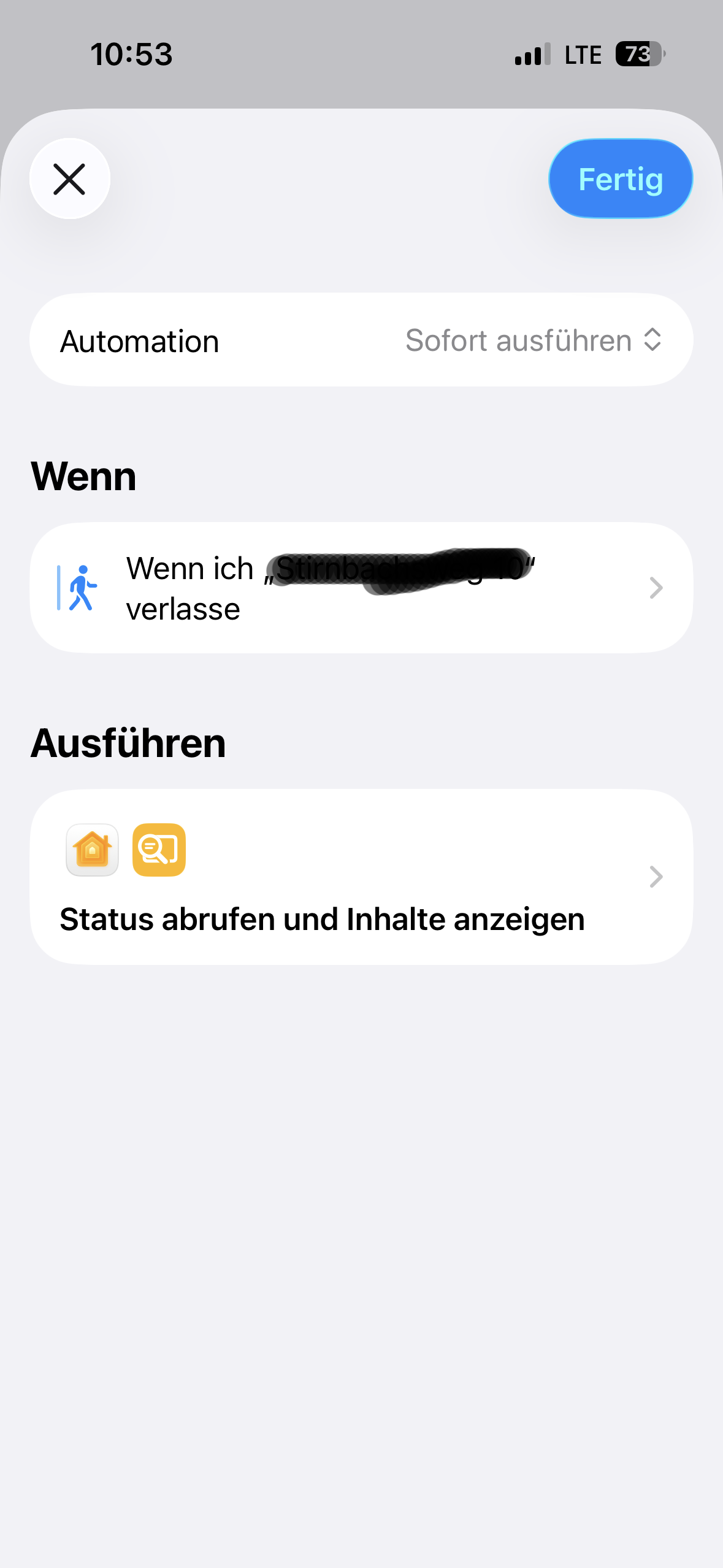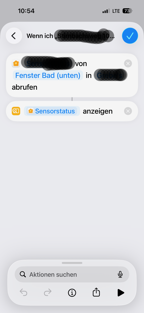 ich möchte gerne in der Kurzbefehle App eine Automation erstellen, die mir den Status und den Namen eines Sensors anzeigen, wenn ich mein zuhause verlasse. Konkret geht es dabei um Fenstersensoren die anzeigen, ob das Fenster auf oder zu ist. Folgendermaßen bin ich bis jetzt dabei vorgegangen: