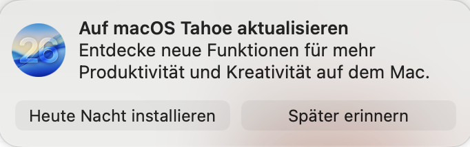 Ja, Apples Druck zum Update nimmt nachweislich zu. In den Systemeinstellungen lässt sich z.B. die rote „1“ am Programmsymbol nicht mehr ohne Update auf Tahoe entfernen. Das erinnert doch sehr stark an den Versuch einer Zwangsbeglückung.