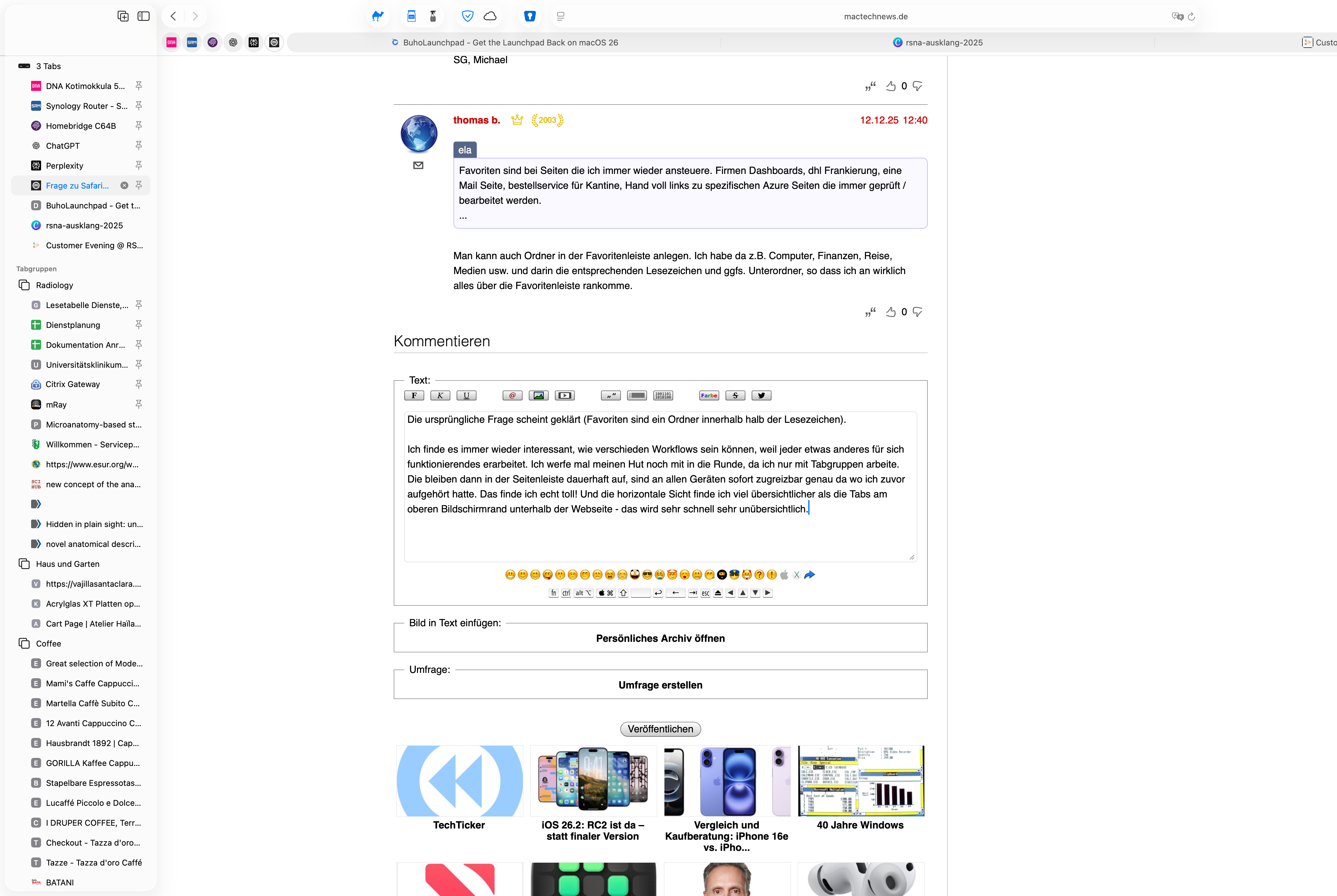Die Safari-Seitenleiste finde ich seit macOS 26 unbrauchbar. Vorher habe ich die gern zum organisieren der Lesezeichen benutzt, das geht jetzt leider nur noch vergleichsweise umständlich über Menu