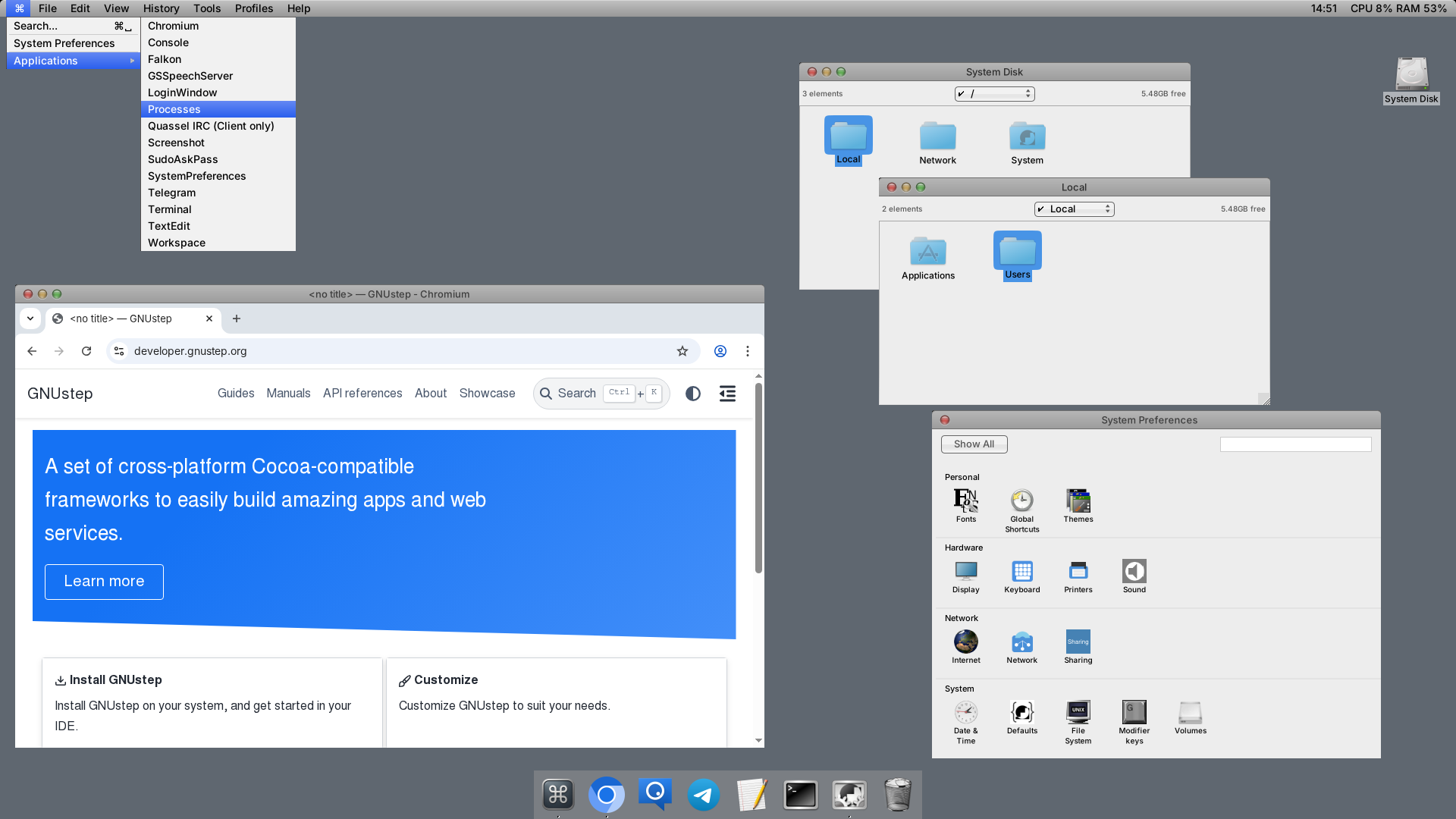 , das Mac-Binaries in einem alternativen MacOS-Betriebssystem lauffähig machen möchte, hier ein neues Thema, welches im Grunde genommen lediglich das Look & Feel von MacOS (bzw. Ansätze von NextStep, da auf GNUstep basiert