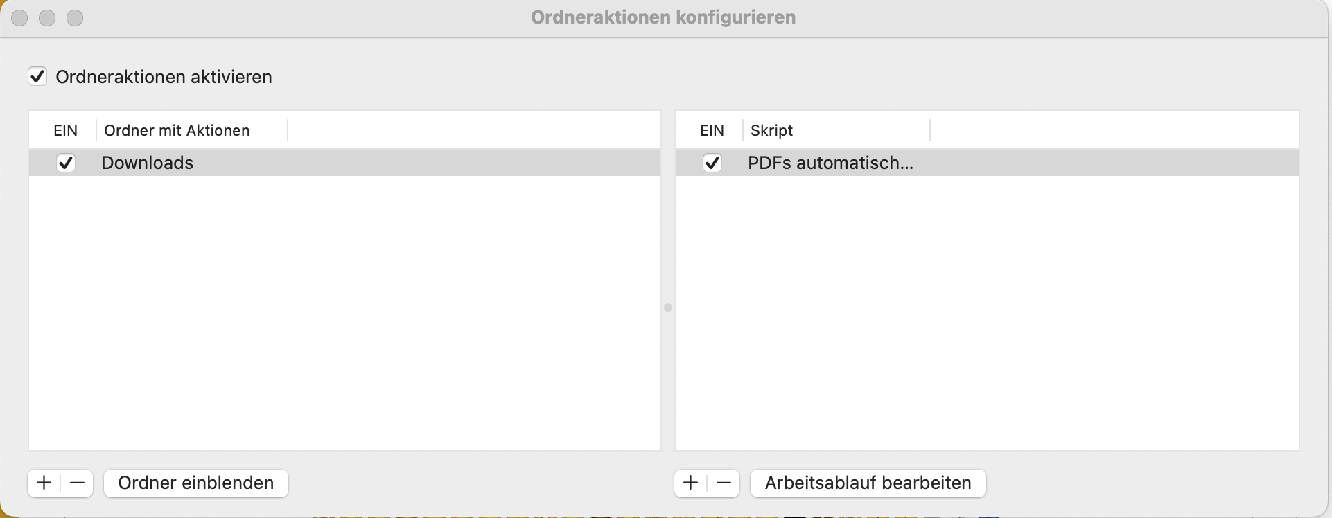 Es gibt eine versteckte App namens "Ordneraktionen konfigurieren" bzw. "Folder Actions Setup.app"