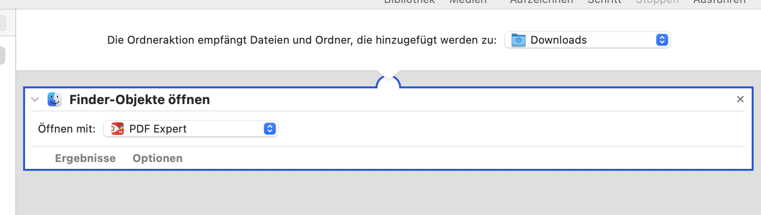 Aber was ich jetzt bräuchte, ist, wenn ich ein PDF in den Download Ordner ablege, sich dieses automatisch in PDF Expert öffnet. Es soll nicht gefragt werden und es sollen auch keine Bilder od. ähnliches geöffnet bzw. konvertiert werden.