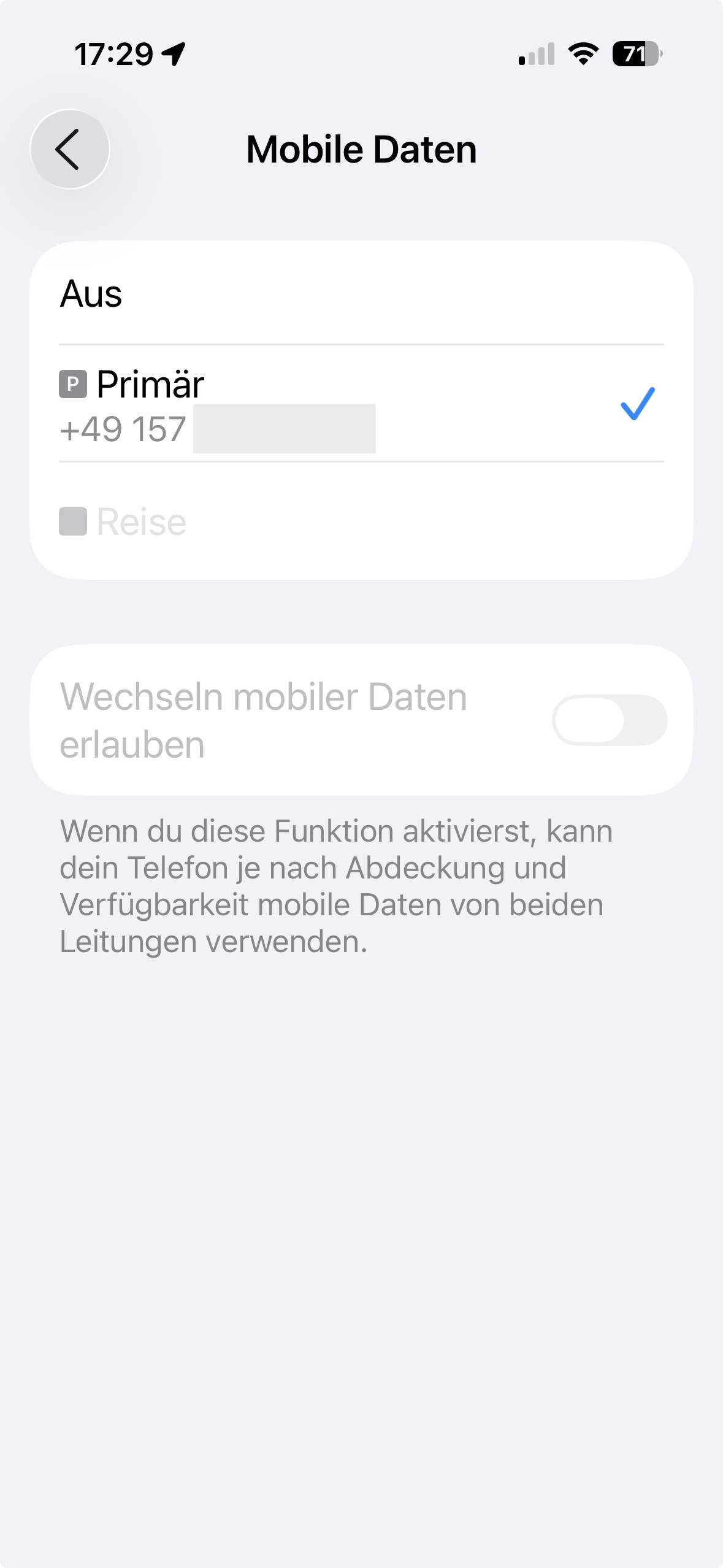 @ttwm + caba: Bei Mobile Daten kann ich nur zwischen Primär und Aus wählen, mehr oder weiter geht da nicht (iOS 26):
