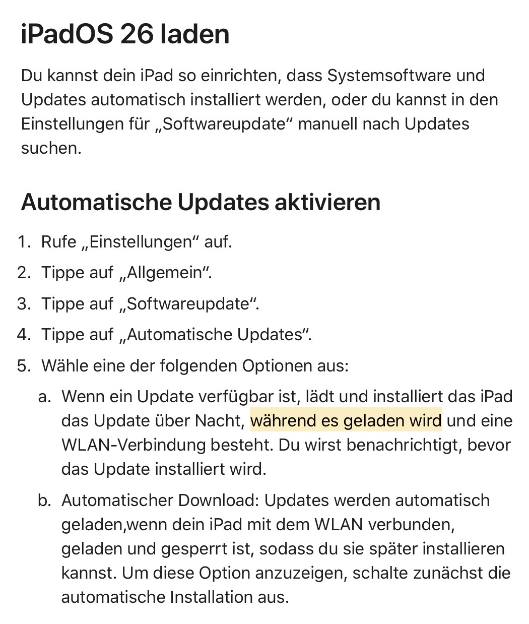 Auch für iPadOS 26 steht im Support Dokument, dass das iPad geladen werden muss.