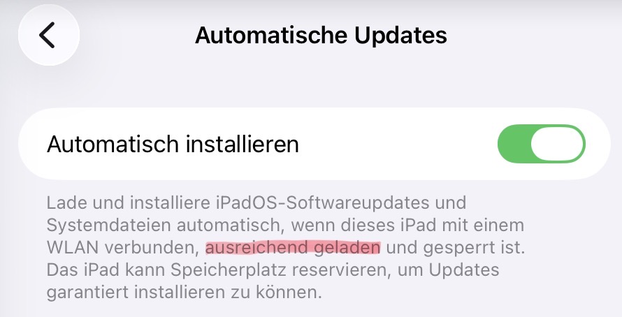 Ich weiß, dass ich bisher jedes Update manuell durchführen musste, denn ich lade mein iPad nie über Nacht. Ich habe aber automatische Updates eingeschaltet. Trotzdem musste ich es immer manuell machen.