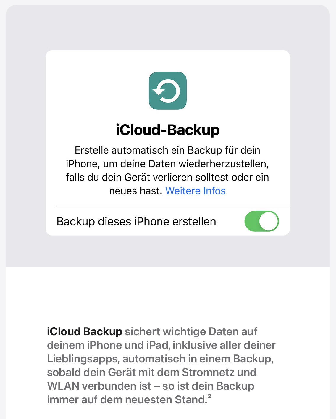 Der Hintergedanke bei Apples Backup der iOS-Geräte in die Cloud ist einfach, dass es beim Verlust ( defekt, Diebstahl, verloren usw. ) des Geräts einfach ist, das neue Gerät aus dem Backup wieder herzustellen. Um mehr geht es Apple dabei auch nicht – was auch in dem Text auf Deinem ScreenShot steht …