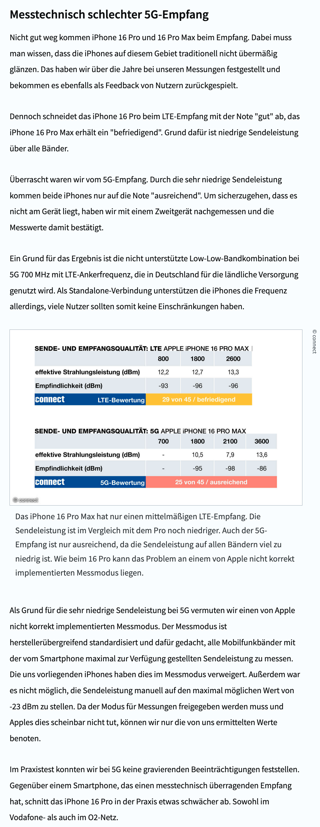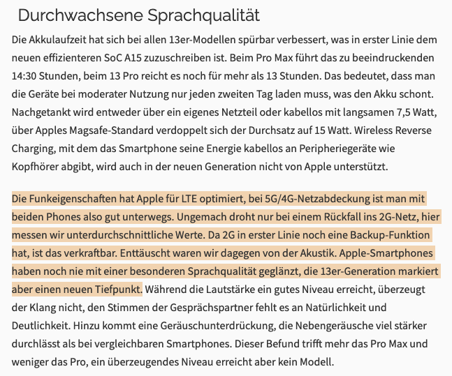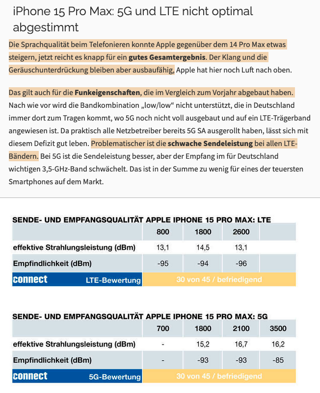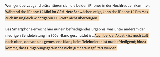 "[…] Als Grund für die sehr niedrige Sendeleistung bei 5G vermuten wir einen von Apple nicht korrekt implementierten Messmodus. Der Messmodus ist herstellerübergreifend standardisiert und dafür gedacht, alle Mobilfunkbänder mit der vom Smartphone maximal zur Verfügung gestellten Sendeleistung zu messen. Die uns vorliegenden iPhones haben dies im Messmodus verweigert. Außerdem war es nicht möglich, die Sendeleistung manuell auf den maximal möglichen Wert von -23 dBm zu stellen. Da der Modus für Messungen freigegeben werden muss und Apples dies scheinbar nicht tut, können wir nur die von uns ermittelten Werte benoten.