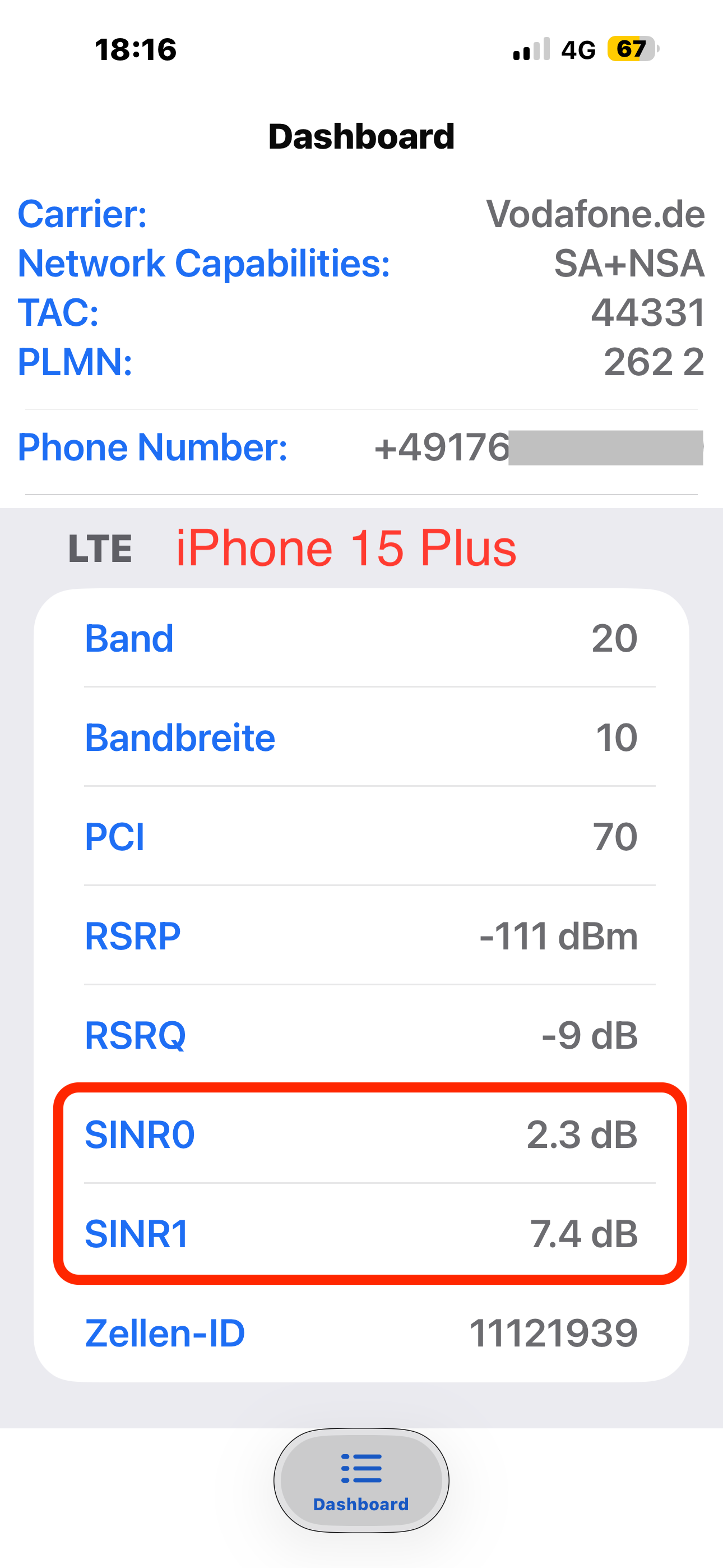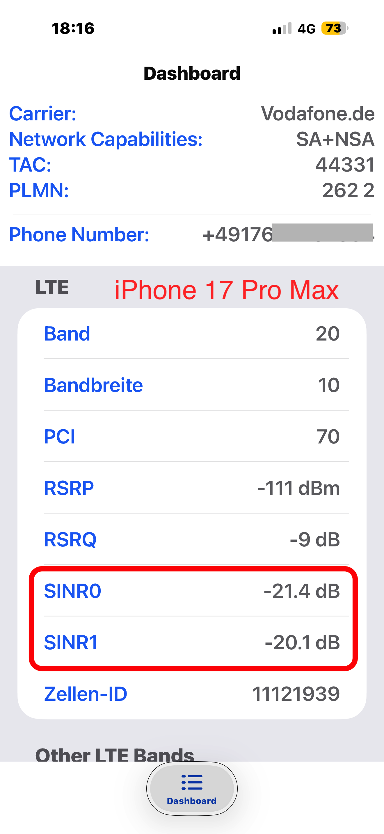 Warum gibt es bei den Werten SINR0 und SINR1 zwischen den beiden iPhones so deutliche Abweichungen… bei ansonsten identischen Parametern? Welches der beiden Geräte schneidet nun tatsächlich besser ab?
