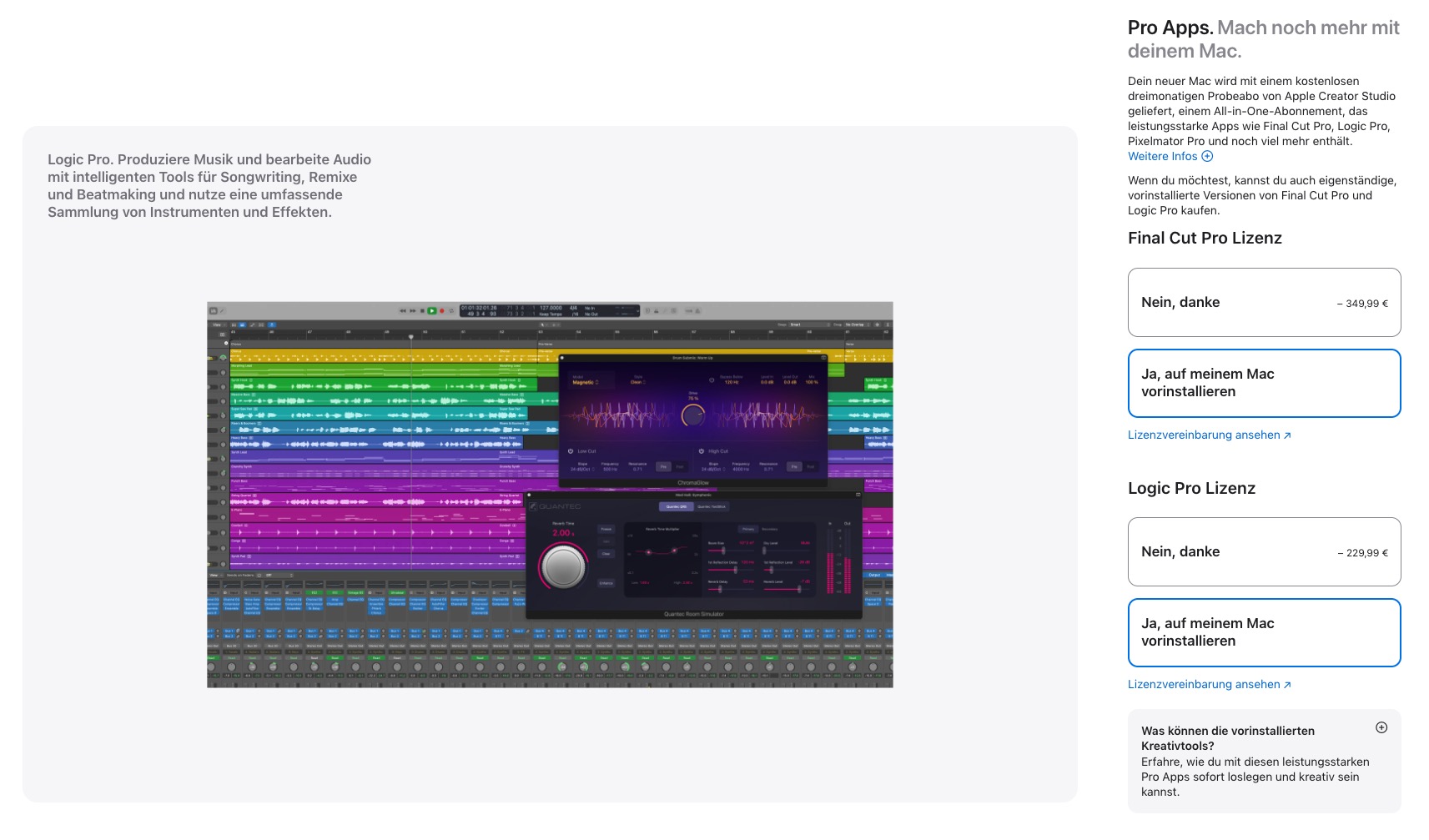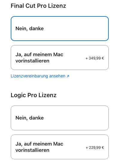 Wenn man einen Mac im Apple Online Store konfiguriert, wird man ja seit langem neben Hardware-Optionen zu Arbeitsspeicher und so weiter am Ende auch gefragt, ob man eines der professionellen Apple-Softwarepakete (