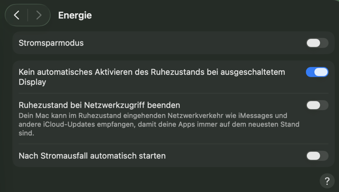 Der Unterschied: Ich habe sämtliche Standby/Ruhezustandoptionen im Mac mini deaktiviert. Weil der M4 so energieeffizient ist, brauche ich das nicht. Im laufenden Betrieb mit Roon Server im Hintergrund aber sonst nix aktiv, schluckt der Kleine nur um die 2,5 W. Darum lasse ich ihn immer an.