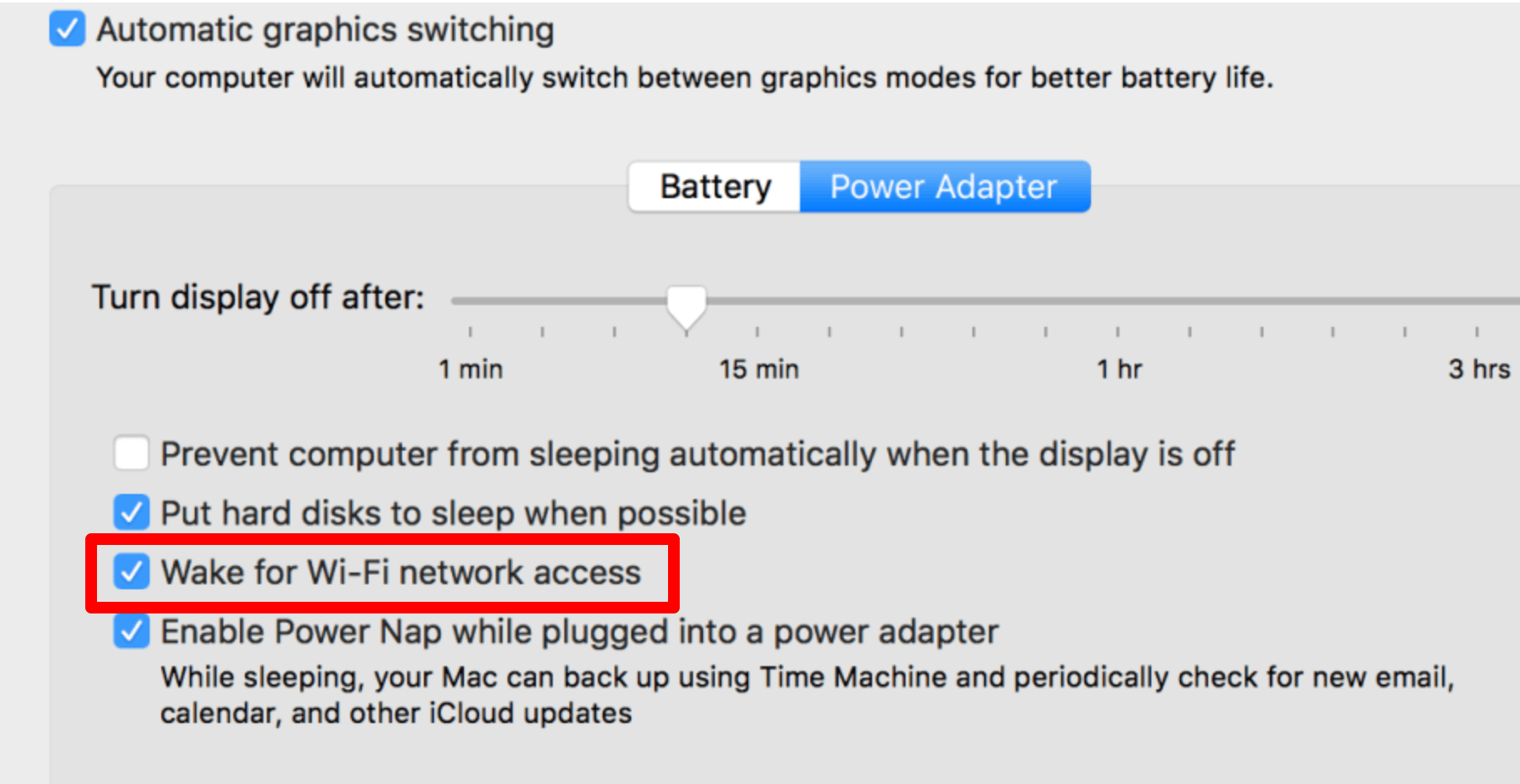Die Trennung zwischen Ethernet und WLAN wurde später von Apple aufgegeben und die Einstellung zusammengelegt, was unteren anderem auch daran liegt, dass viele Macs gar keinen Ethernet-Anschluss mehr haben. In der deutschen Fassung heißt es jetzt "Ruhezustand bei Netzwerkzugriff beenden", egal welcher Typ von Anschluss.