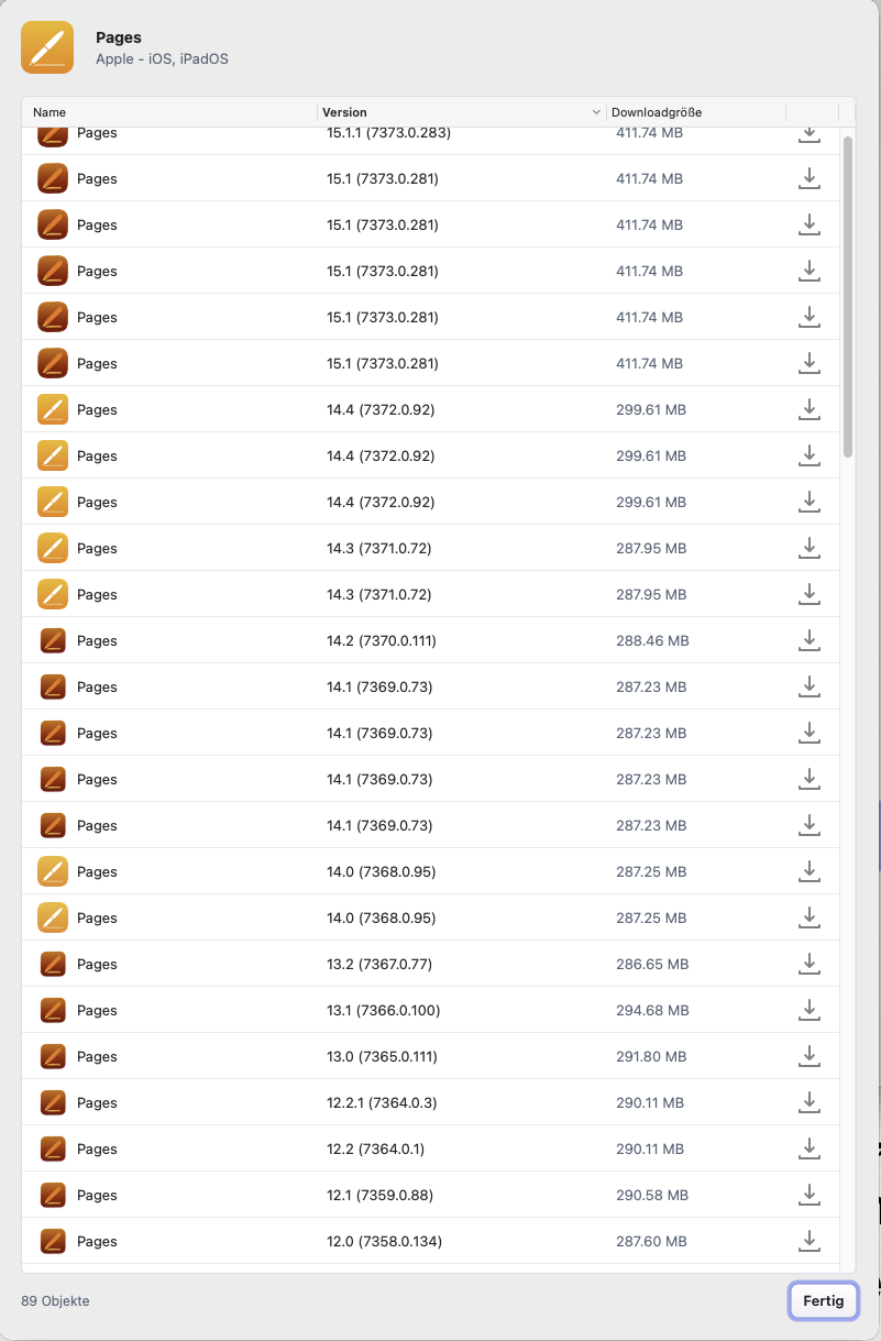 Die nächste naheliegende Idee war dann, auf einem neueren MacOS Pages im MAS zu holen, um dann in der Hoffnung es im MAS unter Catalina in der älteren Version doch wieder antreffen zu können.