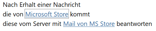 Damit es unverfänglich ist, habe ich den MS Store als Absender genommen. Wenn eine Mail von genau diesem Absender eingeht, wird vom Server an eine andere Mailadresse von mir ein Mail mit dem Hinweis (dessen Betreff habe ich "Mail vom MS Store" genannt) auf die von genau diesem Absender bei mir eingegangene Mail versandt.