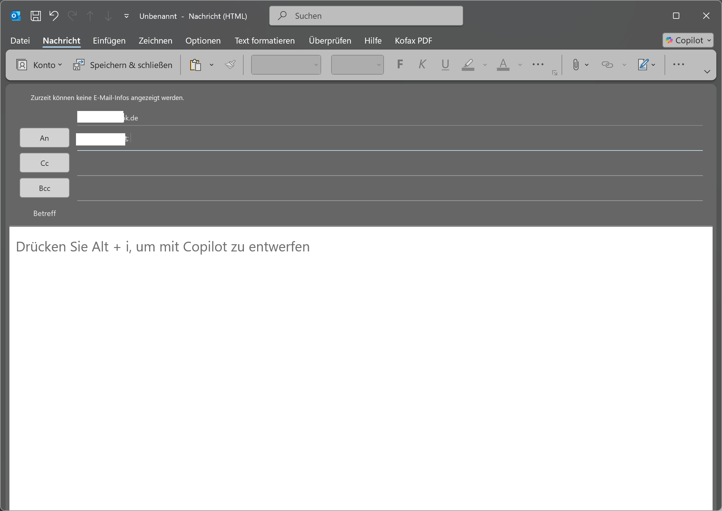 auf "einer Nachricht" klicke, dann geht dieses Fenster auf, wo ich unter "An" meine E-Mail-Adresse eintragen kann:
