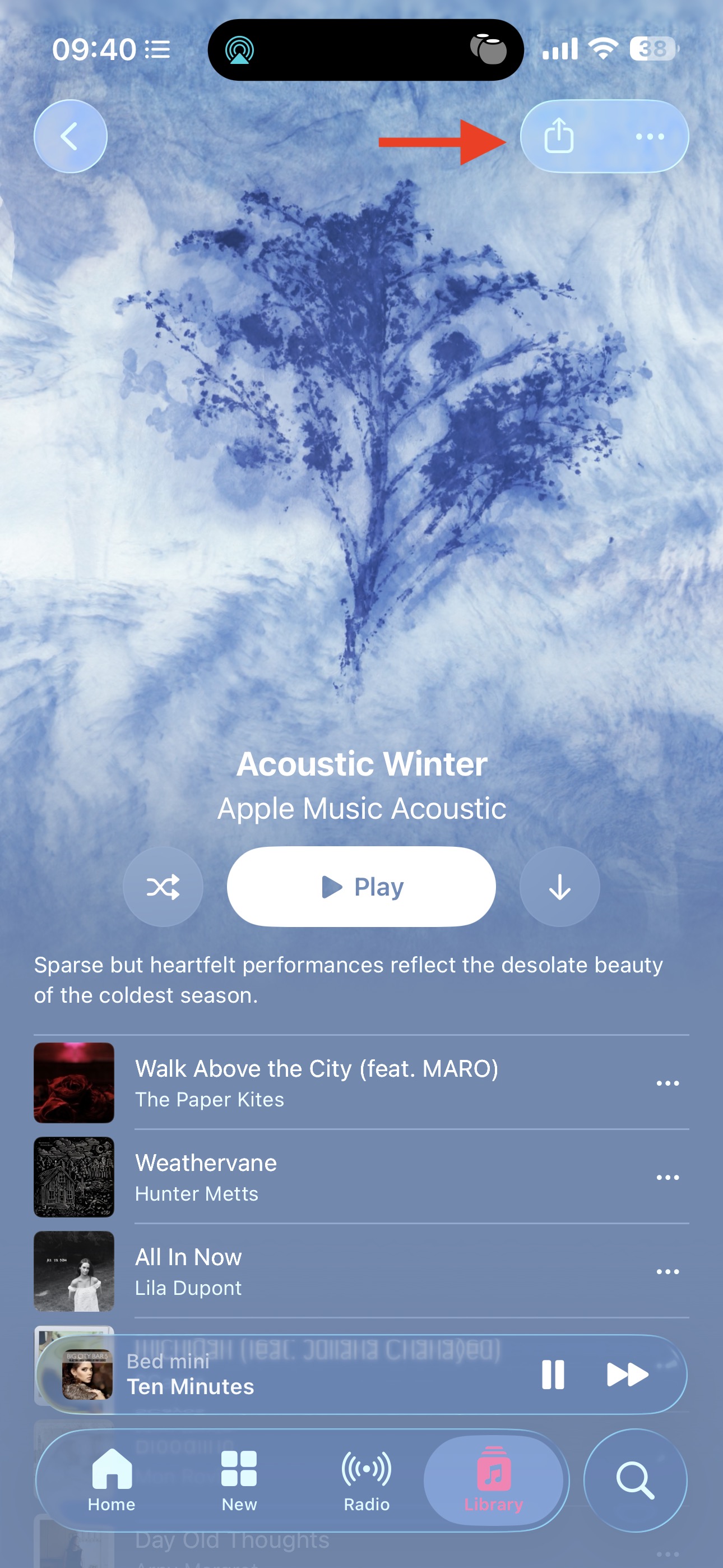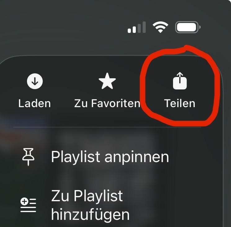 Ich möchte auf meinem iPhone eine Musik-Playlist mit meiner Frau teilen. In verschiedenen Beschreibungen habe ich gelesen, dass man in der Musik-App die entsprechende Playlist auswählt und rechts oben die drei Punkte anklickt. Dort sollte es dann eine Teilen-Funktion geben. Diese Funktion ist bei mir nicht vorhanden.