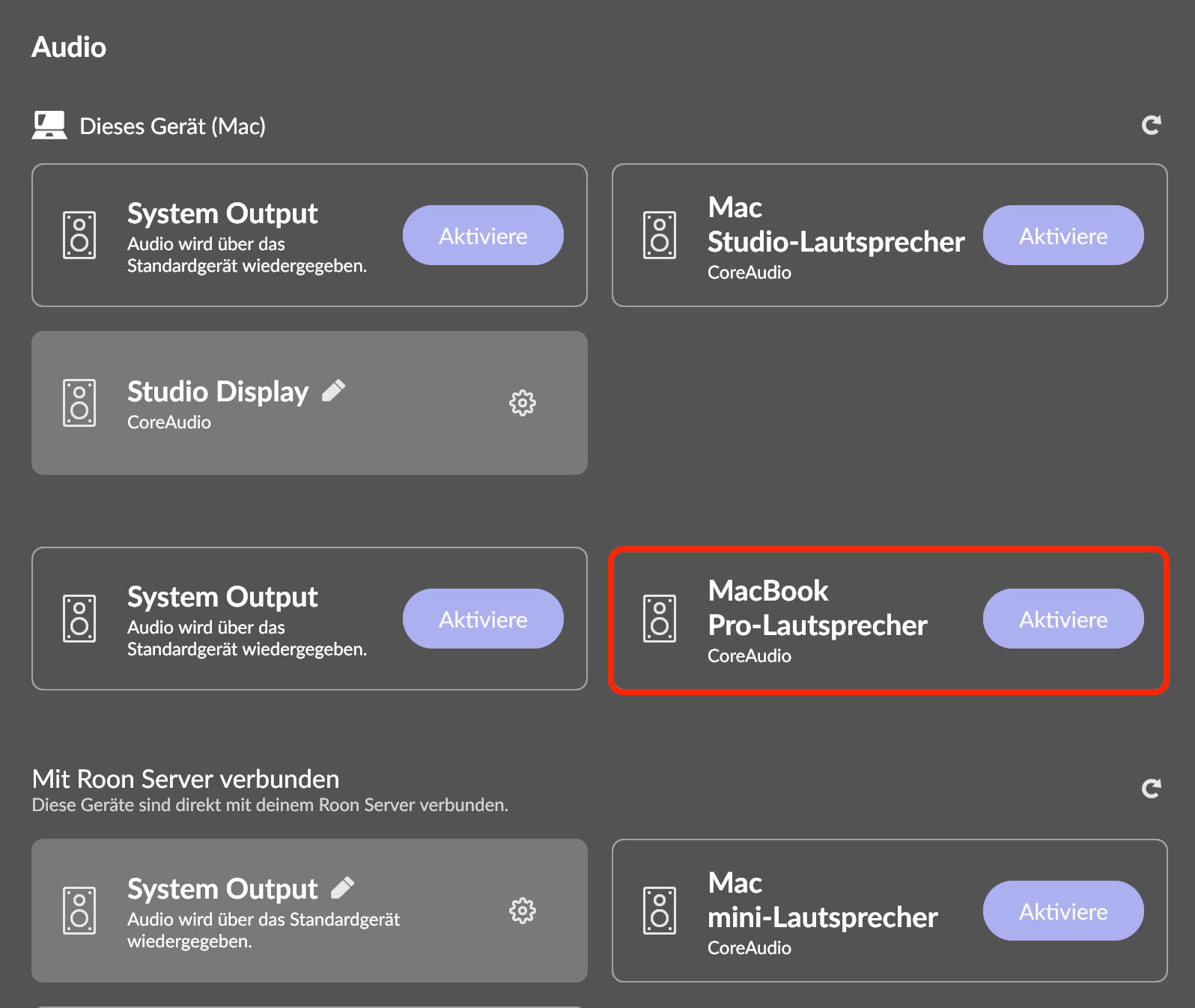 Du musst einfach nur in den Roon-Einstellungen > Audio die Lautsprecher des MacBook aktivieren.