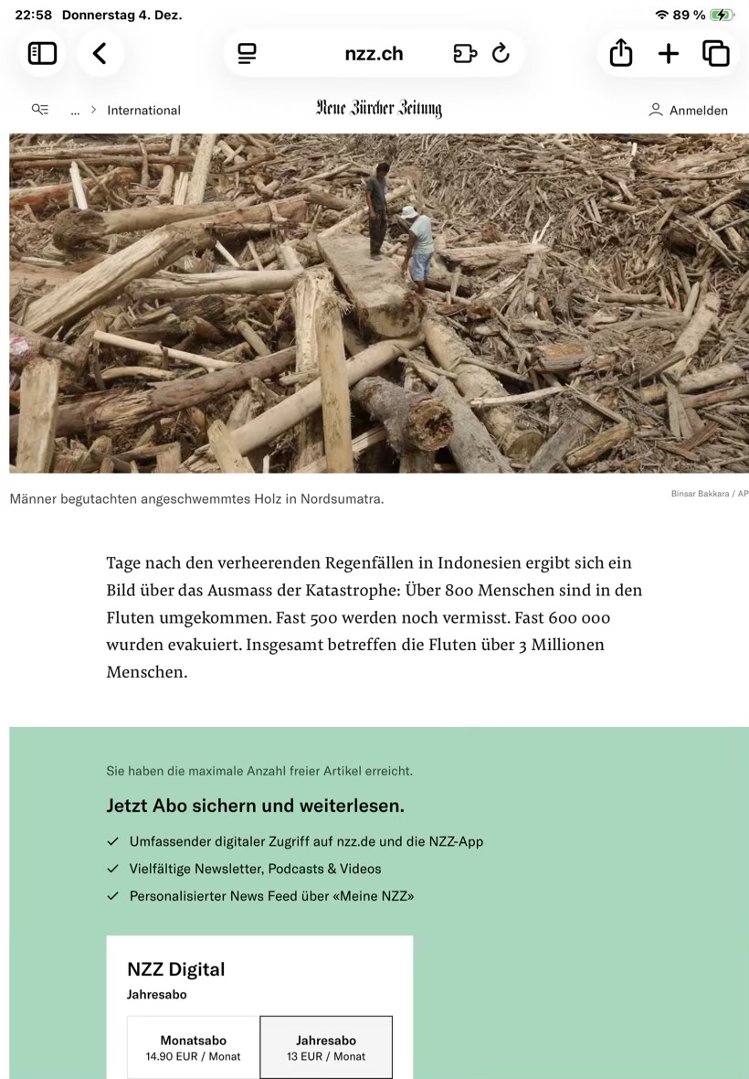 Die Lesebeschränkung für vollständige Artikel ohne Abo auf nzz.ch ist bei alter Safari-Version nicht voll aktiv, und bei der Reader-Ansicht ganz weg!