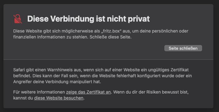 Wenn ich mich mit dem Apple Browser auf meine Fritzbox einwählen möchte, bekomme ich immer so ein Hinweis angezeigt. Kann ich das umgehen ?