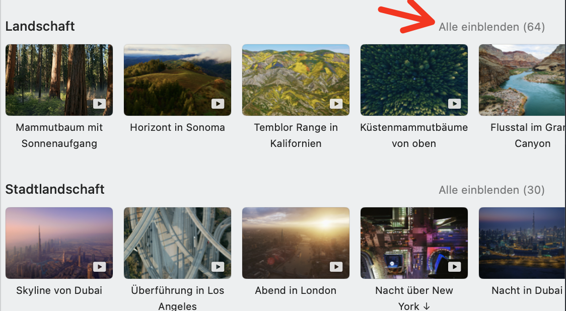Scrollen Sie zu den Abschnitten wie "Landschaft", "Stadtlandschaft", "Unterwasser" oder "Erde".