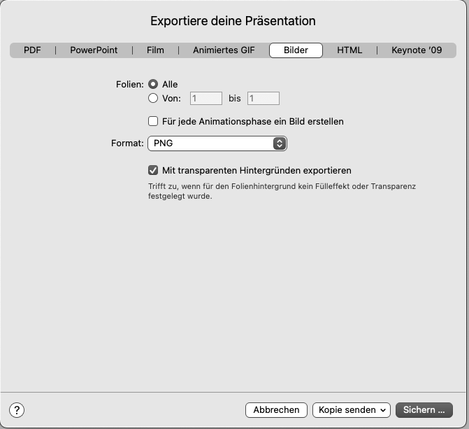 In Keynote schaff ich es nicht ein Transparentes Bild zu exportieren obwohl die Folie angepasst ist.