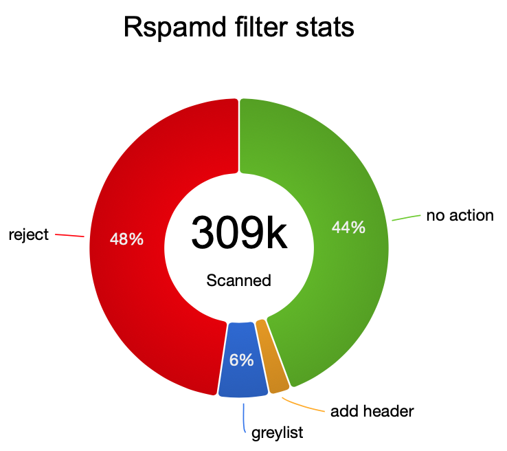 Weitere 6% wurden Greylisting unterzogen, also erst einmal abgelehnt und dann darauf gewartet, ob sie erneut zugestellt werden. Das funktioniert erstaunlich gut, weil SPAM-Schleudern sich die Arbeit oft nicht machen.