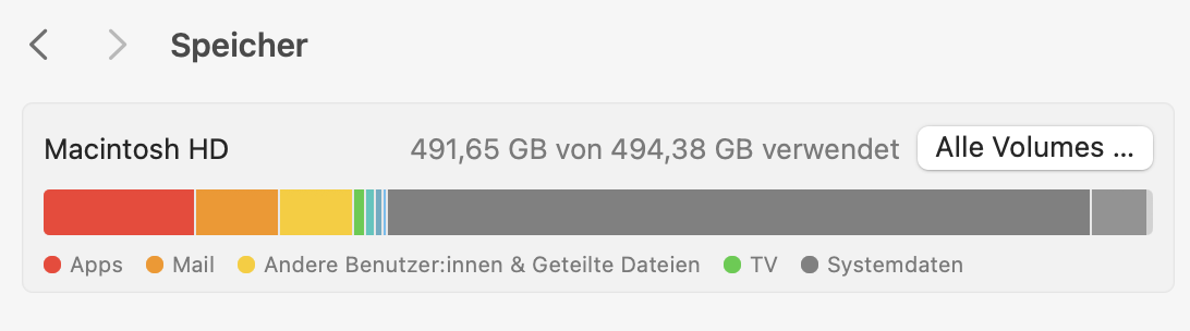 Ich bin beim verzweifeln. Ich habe auf meiner SSD 1.27 TB an "Systemdateien" die ich nicht finden kann. CleanMyMac findet nichts und auch diverse anderen Sachen wie Gehe zu Ordner oder denn wich den Library Ordner einblende find ich nichts. Ein Drüberisntallieren von Tahoe hat auch keine Abhilfe geschaffen.