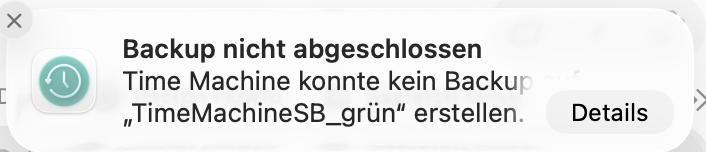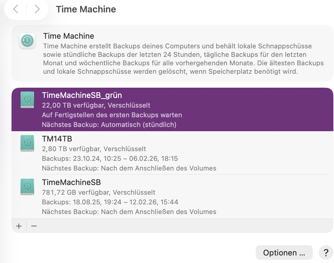 Bei lokalen Medien sollte es "eigentlich" kein Problem sein. Trotzdem bin ich kein Freund von Umlauten bei Laufwerksnamen. Vielleicht stolpert der TM Dienst über den Umlaut in "TimeMachineSB_grün", auch wenn der Mac grundsätzlich kein Problem damit hat.