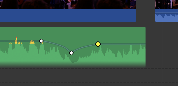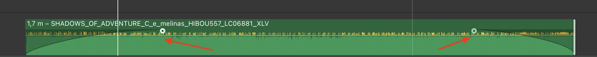 Bei der Audiospur erscheinen beim Aktivieren diese zwei Anfasser, welche das weiche Ein- und Ausblenden ermöglichen.