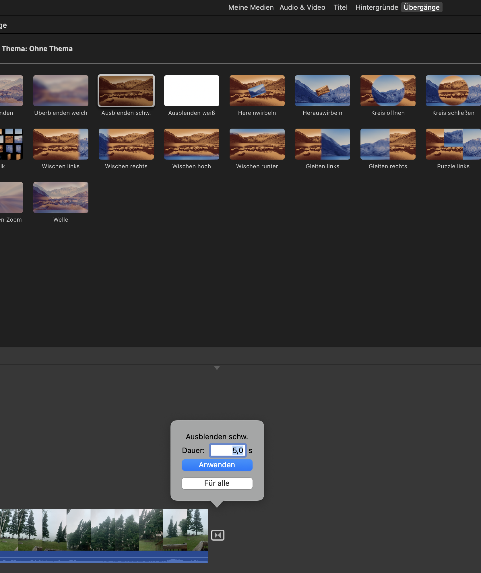 Nachdem der Übergang aus der Auswahl oben (hier Ausblenden schwarz) an das Ende des Clips gezogen und dort platziert ist, einen Doppelklick auf diesen Marker (oder wie das heißt) dann öffnet sich ein Menü um die Ausblendzeit (Dauer) zu ändern. Musste etwas rumspielen da es nicht sofort akzeptiert wurde, sowas wie Clip zu kurz. Aber .... es hat dann prima funktioniert.