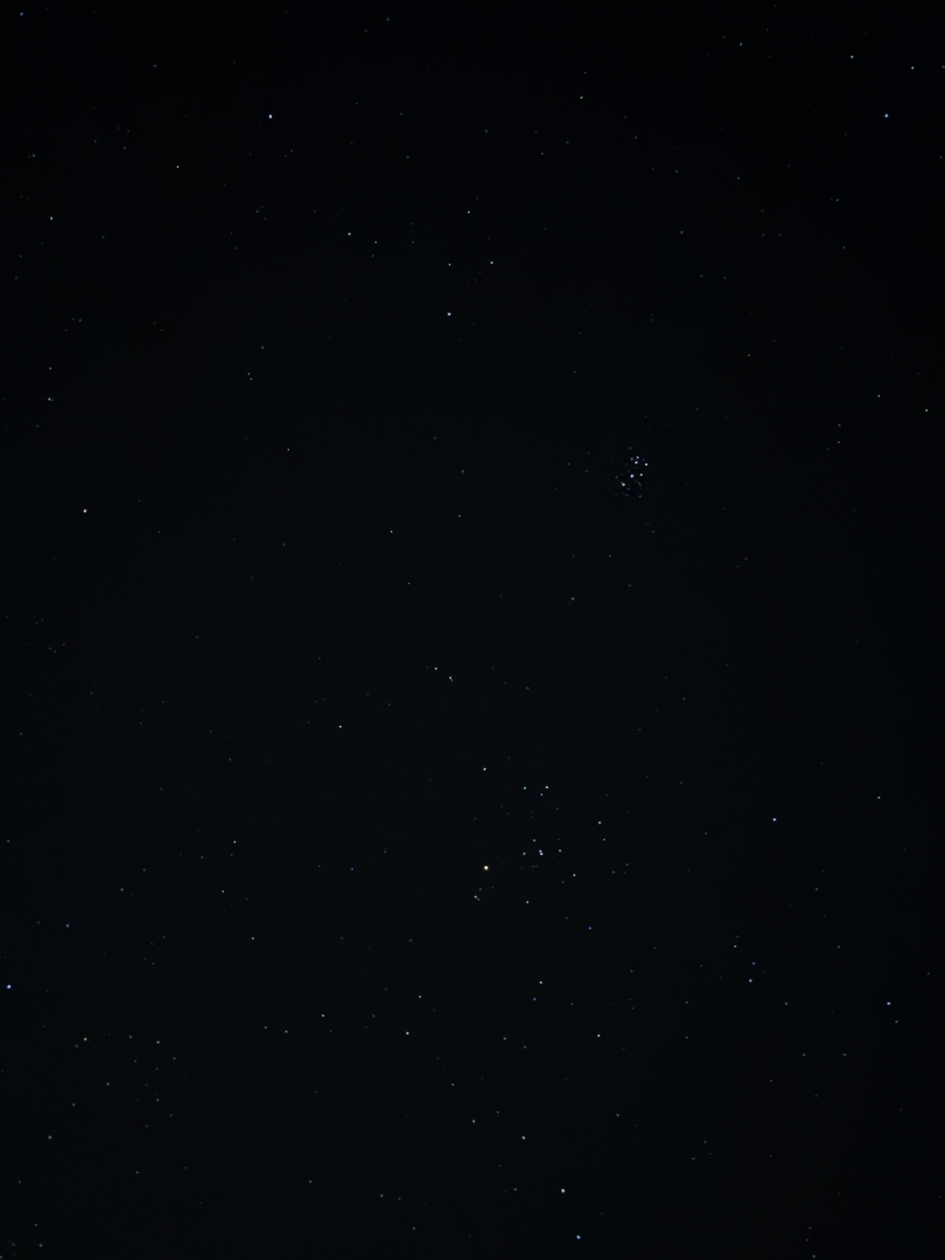 The most distinct group of stars, located in the upper-middle section of the image, is the Pleiades (also known as Messier 45 or the "Seven Sisters"). This is not a constellation but an open star cluster, a group of young, hot blue stars that are gravitationally bound. To the naked eye, it looks like a tiny, misty dipper.
