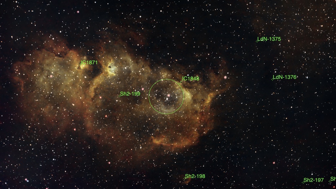 (IC1848 - Seelennebel mit astrometrischen Markierungen - reduzierte Auflösung, auf meinem MBA M4 in Siril mit Graxpert nachbearbeitet)