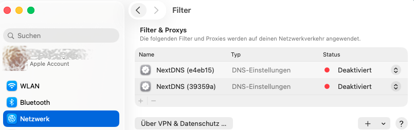 Auf meinem MacBook Air M2 unter MacOS 26.4 haben sich nach zwei "Umzügen" leider noch zwei Profil-Einträge für NextDNS erhalten, das ich vor 4 Jahren mal (per Profil) installiert hatte. NextDNS ist nicht mehr aktiv und ich habe die beiden Profile auch abgeschaltet. Leider sind sie als eine Art Dateileichen noch immer im System (und funktionieren nach wie vor).