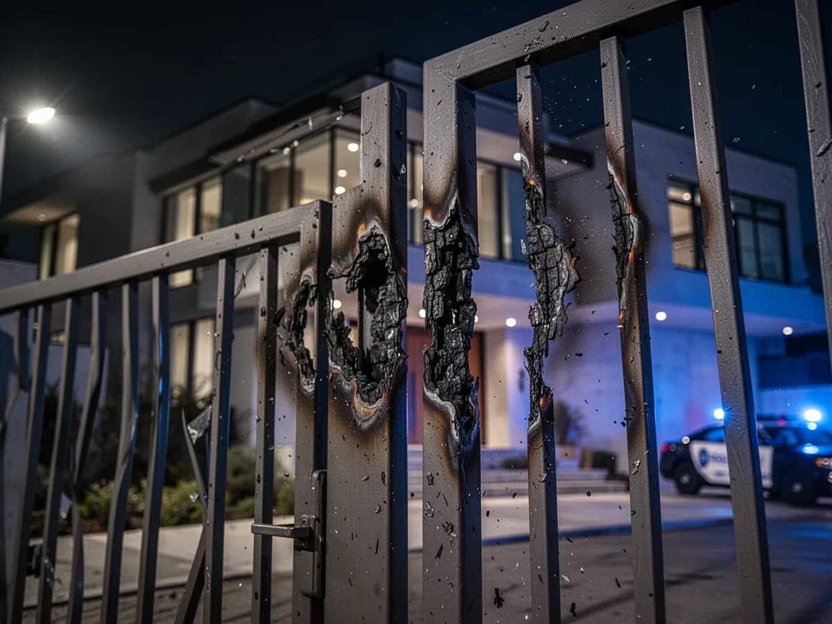 Ein Tor aus Vierkant-Stahl vor einem Wohnhaus. Das Tor zeigt Anzeichen eines gewaltsamen Einbruchs (verbogen Stahlstreben), und Zeichen von Brandschäden, wie sie an einem Tor aus Holz