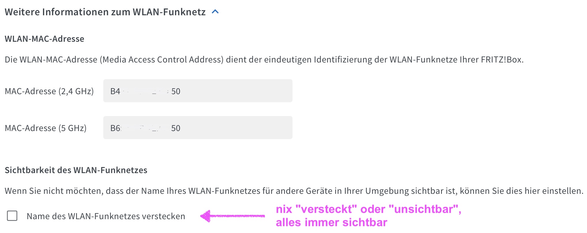 - auf FritzBox sind 2,4 und 5 GHz-WLANs zwar unterschiedlich benannt, sie sind aber def. nicht unsichtbar (also für alle sichtbar)