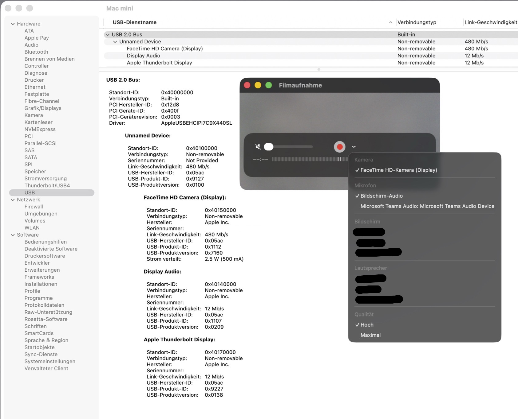 Vorab, die Info dass nach dem heutigen Start des Rechners in den Systeminformationen die Kamera schon als „FaceTime HD Camera (Display)“ in den Systeminformationen (siehe erster Screenshot) angezeigt wurde, allerdings, wie erwartet, konnte sie von den Programmen (QuickTime Player, Teams und FaceTime) nicht angesprochen werden.