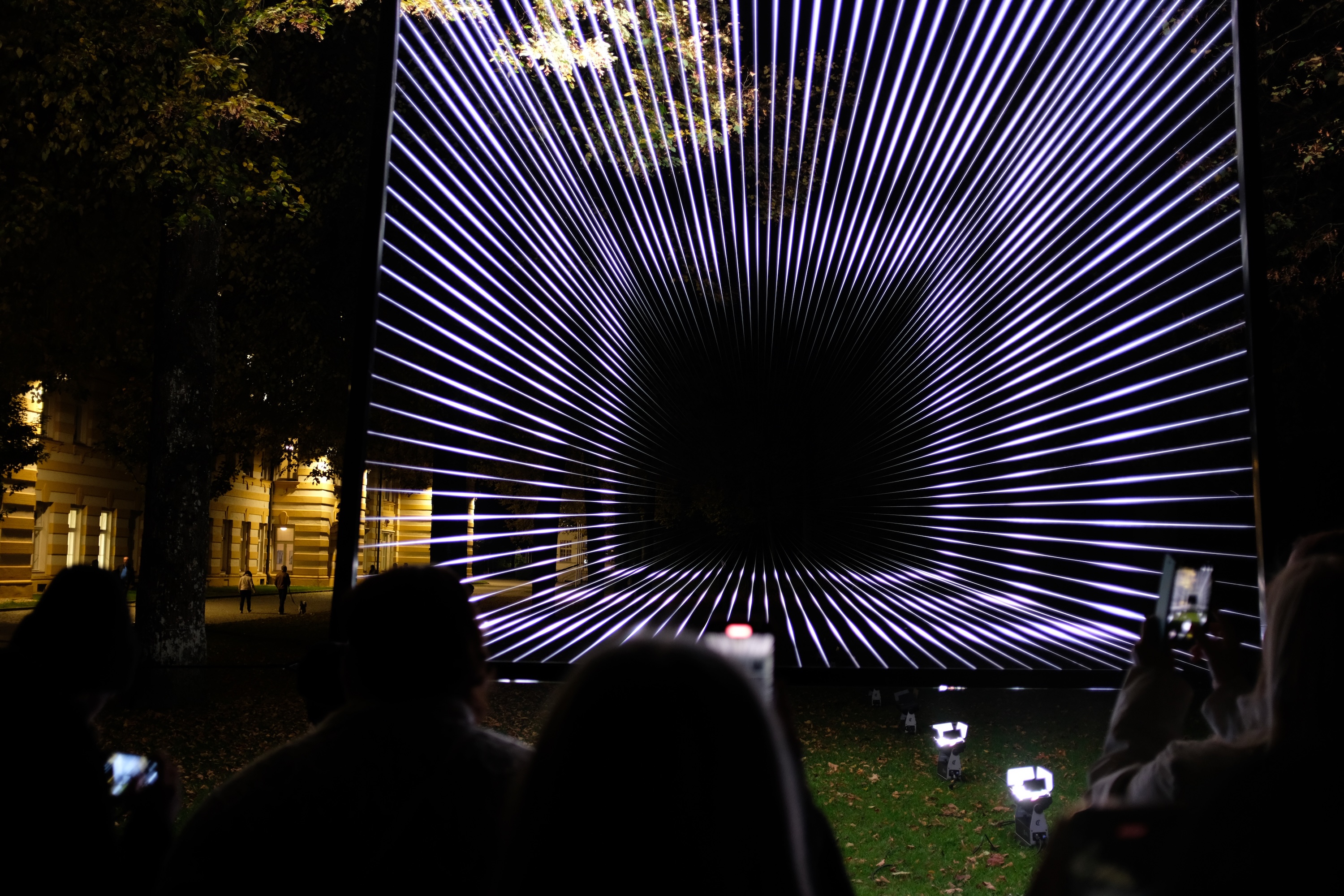 Menschen stehen vor einem Portal und warten mit ihren Mobiltelefonen filmend auf die Ankunft der Reisenden aus einer anderen Dimension.