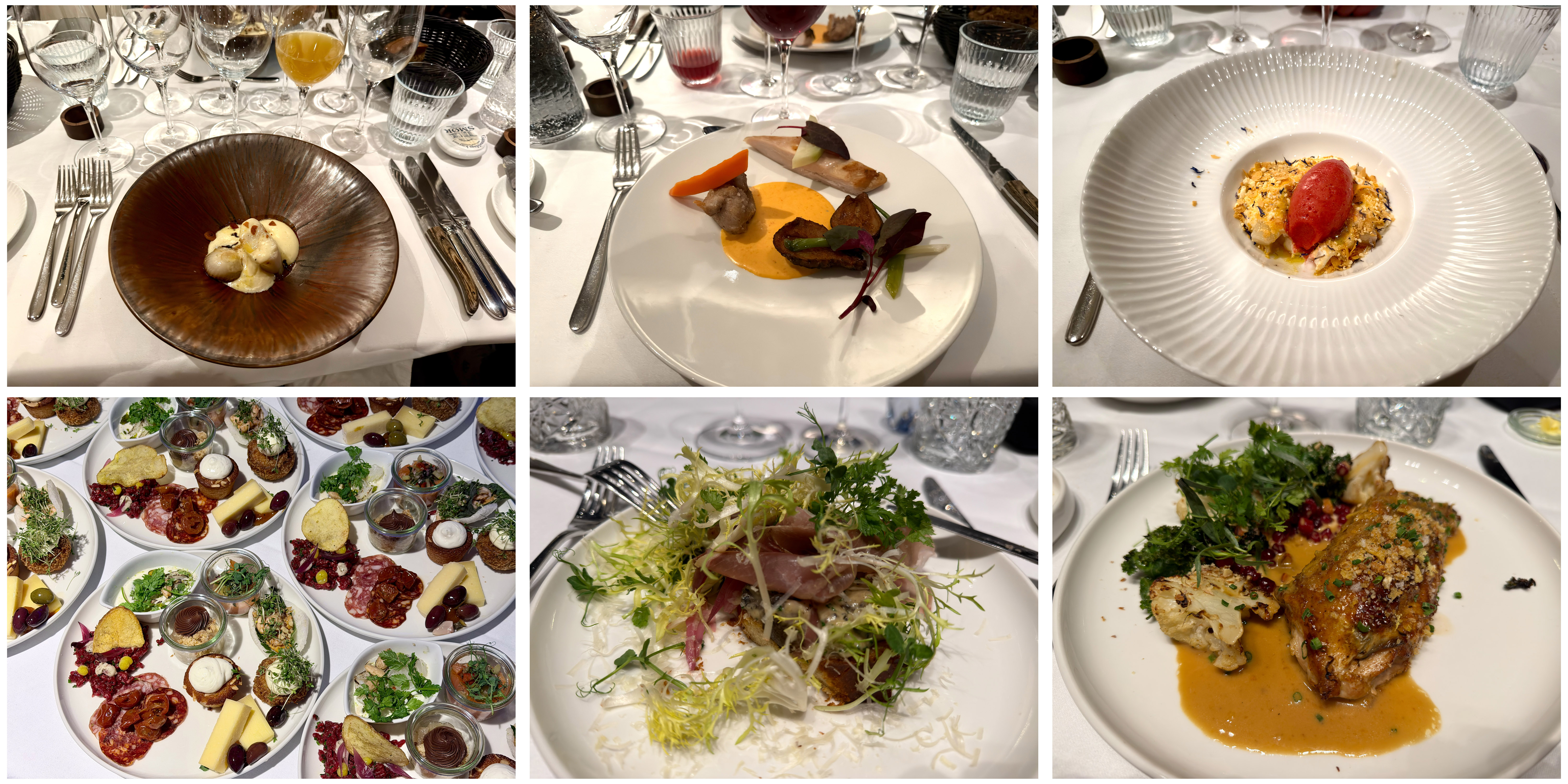 Das unten links ist Teil eines Begrüßungstellers mit diversen Tapas auf dänische Art. Die restlichen Zwei sind Teil eines anderen Menüs, diesmal drei Gänge.