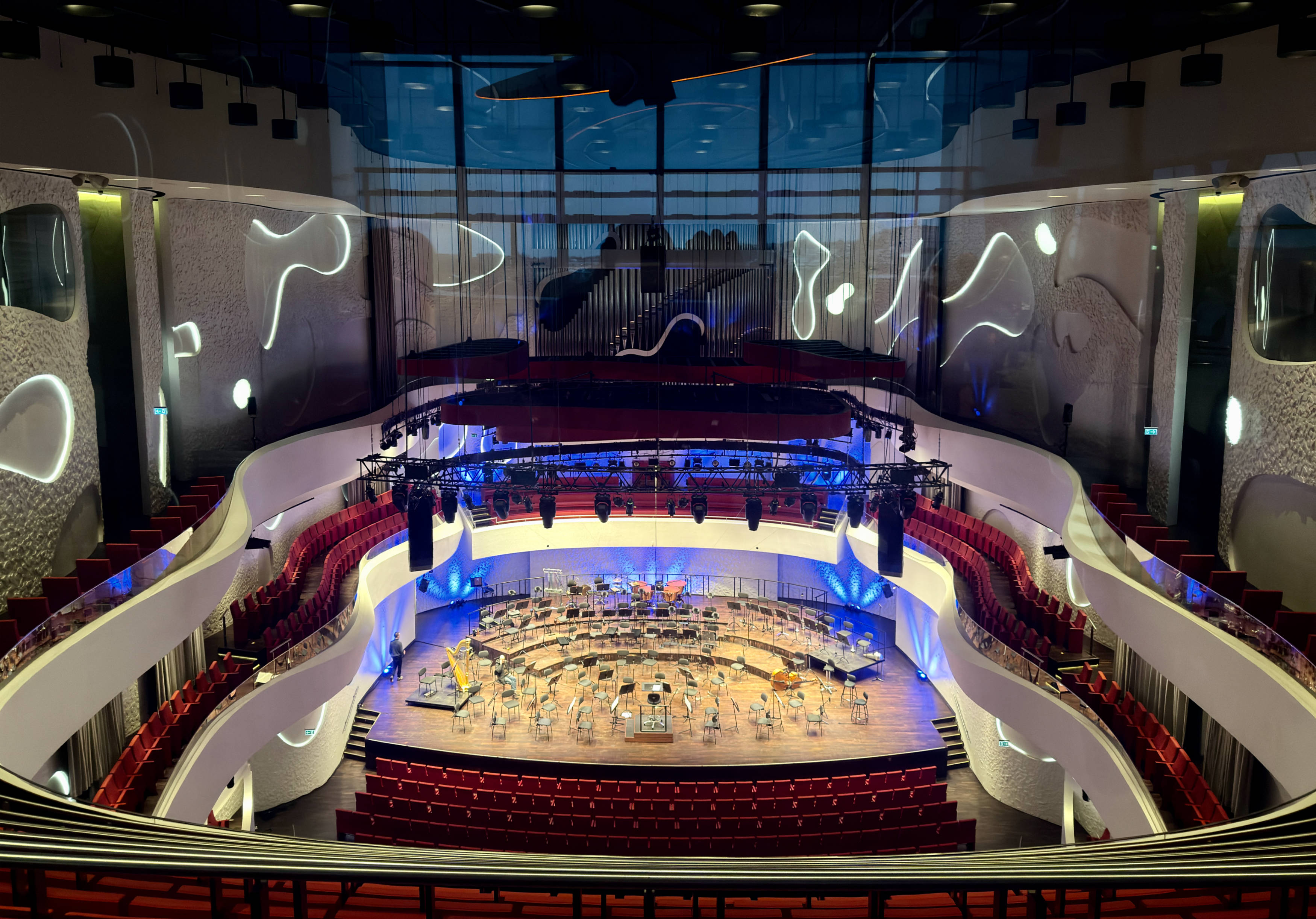 Das Bild ist von Außerhalb des Konzertsaals durch ein Fenster fotografiert, weswegen da auch starke Spiegelungen zu sehen sind, die den Raum hinter mit zeigen (vor allem im oberen Bildbereich). Aber die Spiegelungen machen das irgendwie noch interessanter. Ist auf jeden Fall eine sehr schöne Konzerthalle, deren Besuch sich unbedingt lohnt.