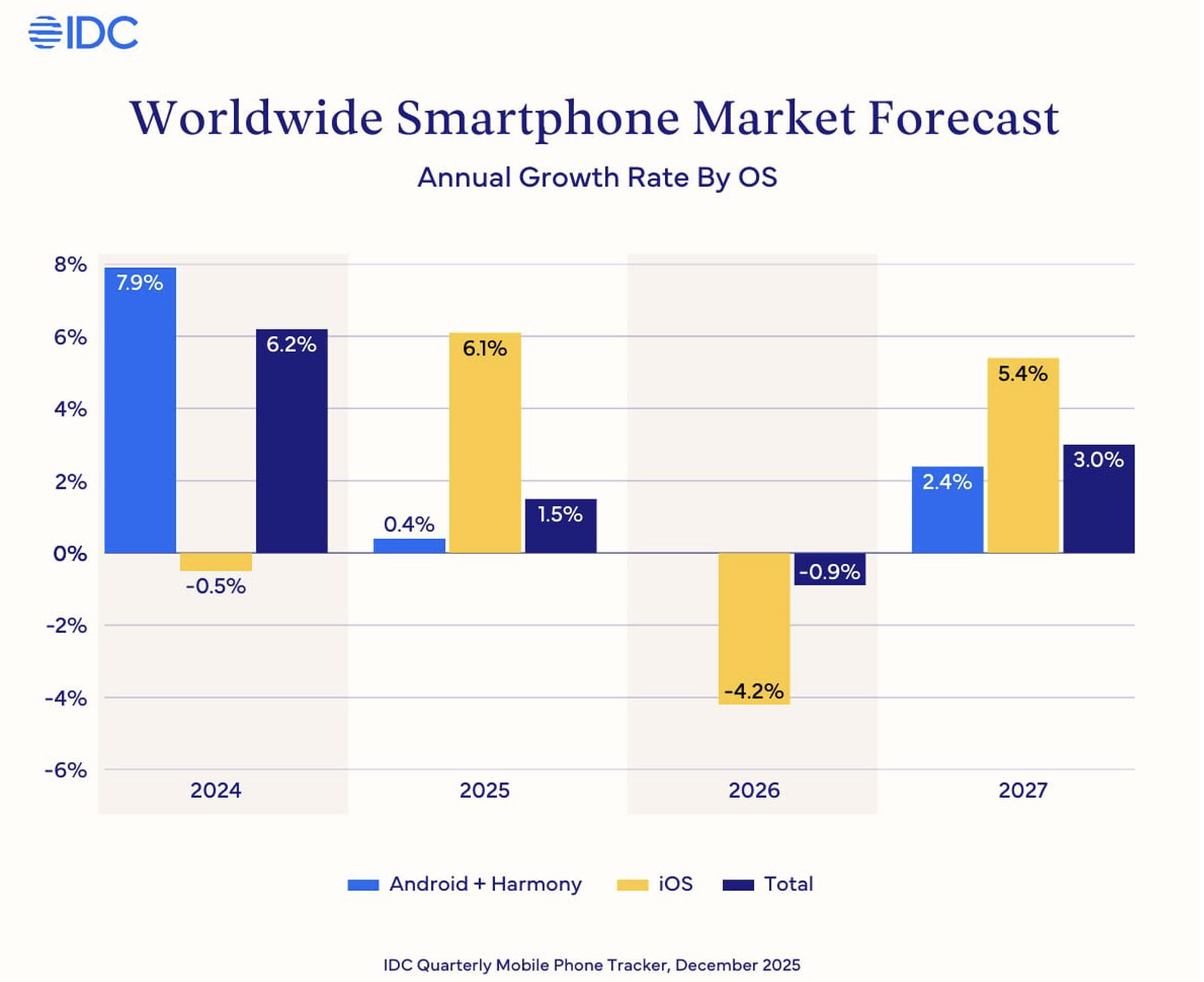 Rückblick und Ausblick 2026 als schwieriges JahrFür 2026 erwartet die IDC allerdings eine schwierige Situation auf dem Gesamtmarkt. Den bisherigen Prognosen zufolge dürfte sich der Markt dann im Minus befinden und um rund ein Prozent schrumpfen. Nach der weit überdurchschnittlichen Performance des iPhones im Jahr 2025 halte man es für wenig wahrscheinlich, ähnliche Ergebnisse auch 2026 zu sehen. Außerdem gesellen sich noch andere Probleme hinzu, denn man rechnet mit deutlich steigenden Preisen für Chips. Die durchschnittlichen Verkaufspreise müssen dadurch zwangsläufig steigen, was stets mit stärkerer Kaufzurückhaltung einhergehe. Besonders betroffen seien Geräte aus dem günstigen und mittleren Preissegment, doch Premium-Devices betreffe die Entwicklung ebenfalls.