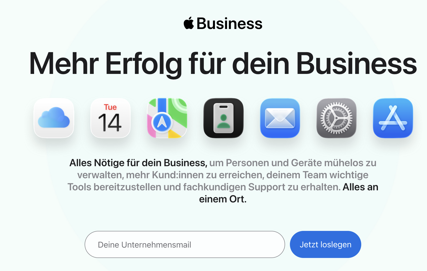 Neue Internetseite und generalüberholte AppApple Business enthält Tools für die Marken- und Standortverwaltung und integriert eine MDM-Lösung. Apple-Accounts lassen sich so zentral verwalten und Apps sowie Software-Updates können auf den Geräten ohne Umwege installiert werden. Hierfür gibt es einen neuen