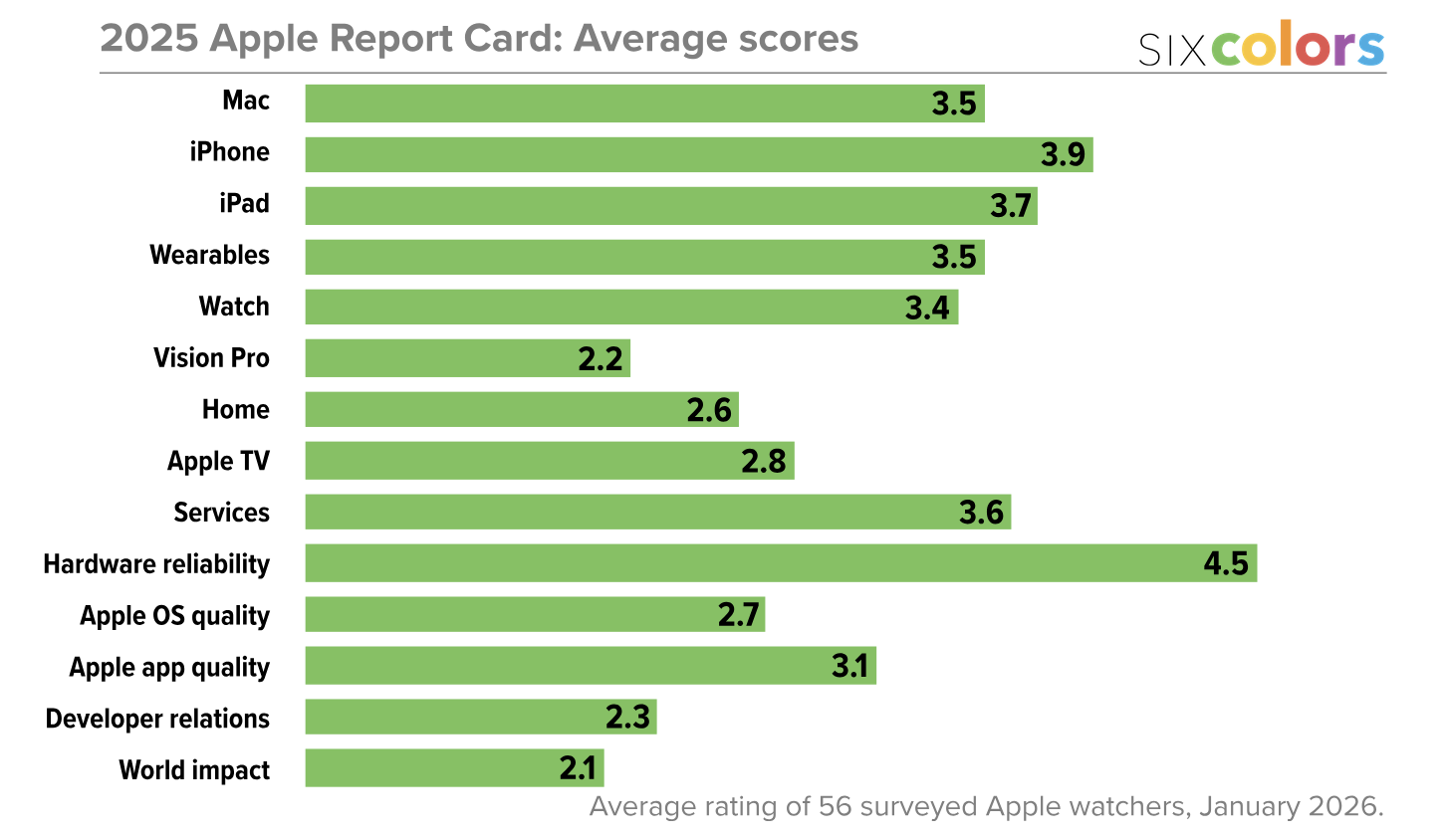 Six Colors. Diese macht es sich zur Aufgabe, Apples Leistungen in einem Jahr aus der Perspektive von Experten zu beurteilen – darunter Entwickler, Redakteure, Podcaster und andere Personen, die sich intensiv mit dem Unternehmen auseinandersetzen. Diesmal hatten 56 Personen die Gelegenheit, auf Apples Bilanz des Jahres 2025 einzugehen und einzelne Kategorien mit ein bis fünf Punkten zu bewerten. Cupertino kommt dabei nicht allzu gut weg.