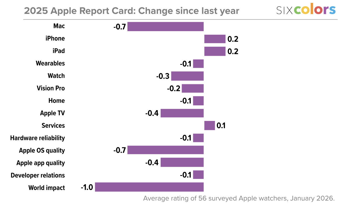 Schlechte Noten für Software-Qualität, Unverständnis für Anbiederung an US-RegierungAndere Produktkategorien glänzten nicht gerade im vergangenen Jahr: Die Home-App wisse nach wie vor nicht zu überzeugen und bei Apple TV habe sich nichts getan. Die Software-Qualität stürzte deutlich ab: Die meisten Beschwerden betreffen Liquid Glass, das wenig Wertschätzung erfährt. Laut Liss muss sich Apple eine Auszeit nehmen, um „im Haus aufzuräumen“: Viele sprechen vor allem Bugs an, deren sich das Unternehmen nicht annimmt. Apple enttäusche zudem mit einer „unterwürfigen Komplizenschaft“ mit der Trump-Regierung, so Gruber. Das Unternehmen hat nach Ansicht einiger Kommentatoren schlicht seine moralische Autorität verloren.