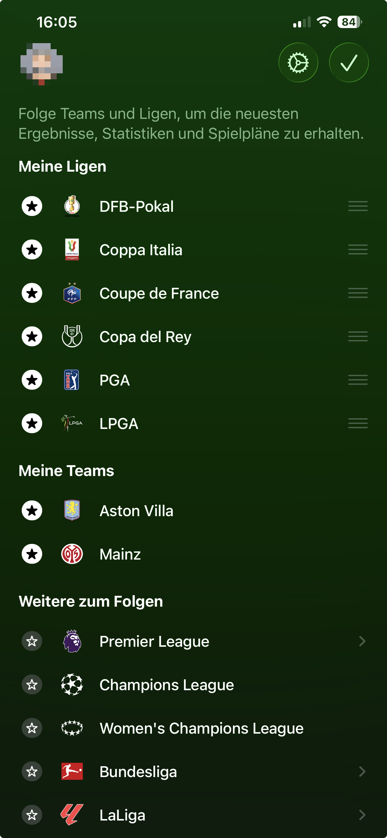 Konfigurierbare AnsichtNutzer wählen in der Sports-App aus, welche Turniere sie interessieren. Bei herausgestellten Sportarten, etwa den beiden oberen Fußball-Bundesligen der Herren, können Nutzer zudem auswählen, welche Teams ihnen am Herzen liegen. In der App erscheint dann ein individueller Spielplan-Kalender. Während laufender Spiele zeigt eine Live-Aktivität auf dem Sperrbildschirm des iPhones den aktuellen Punktestand an, ergänzt von wichtigen Informationen, etwa wer das letzte Tor geschossen hat.