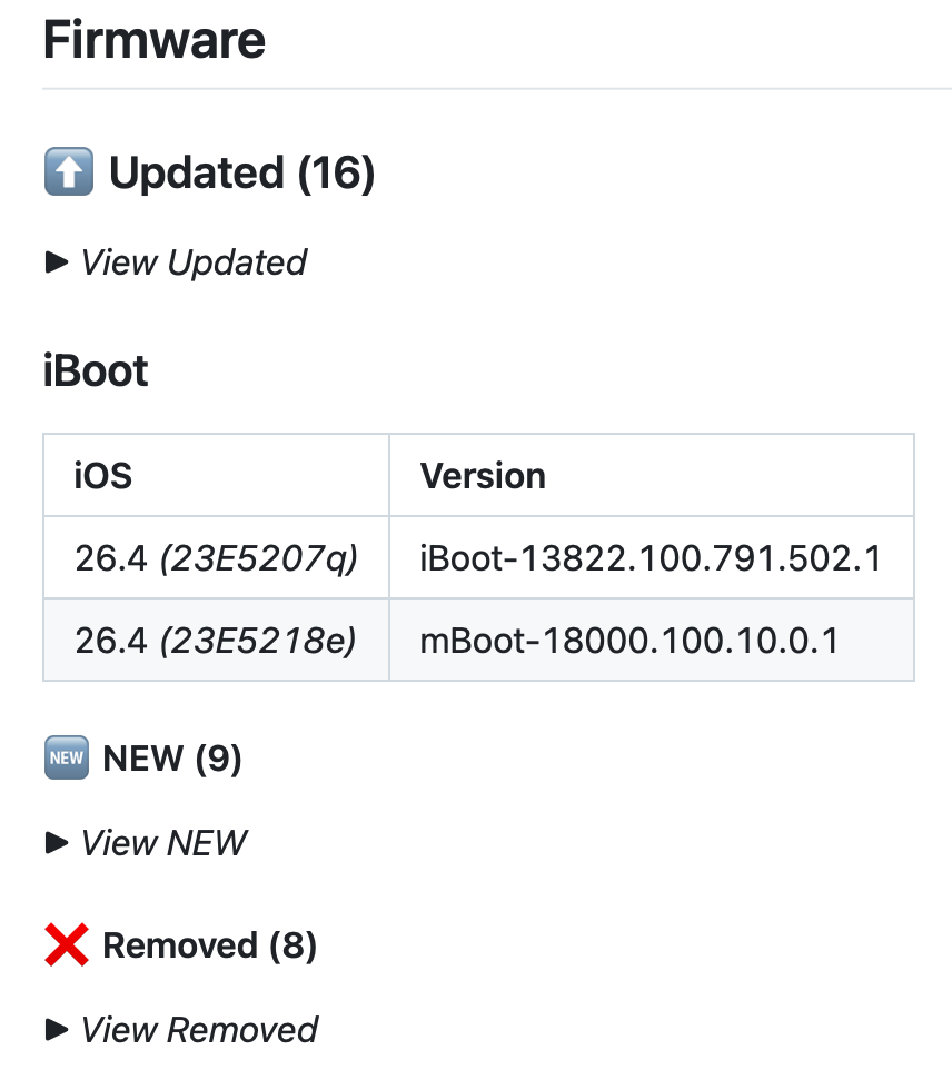 aufgelistet. Unter „iBoot“ findet sich der überraschende Wechsel: Während in der ersten Beta von iOS 26.4 noch iBoot-13822.100.791.502.1 auftauchte, verwendete die zweite Beta mBoot-18000.100.10.0.1 – ohne weitere Erläuterungen. In den Anmerkungen zur Veröffentlichung erwähnt Apple die Änderung nicht.
