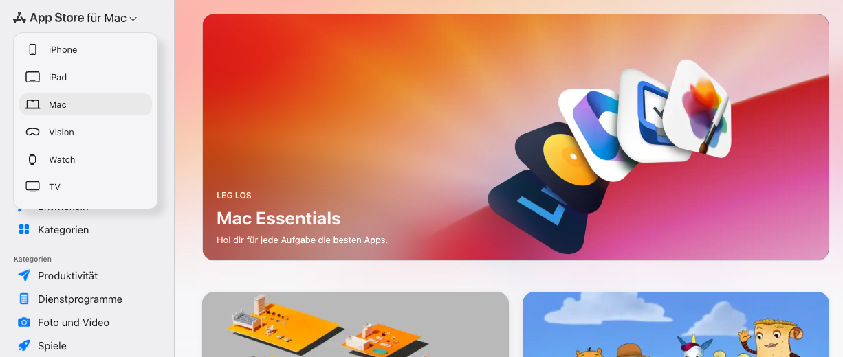 durchstöbern – und zwar in allen sechs Ausführungen, nämlich für iPhone, iPad, Mac, Vision Pro, Apple Watch und das Apple TV.