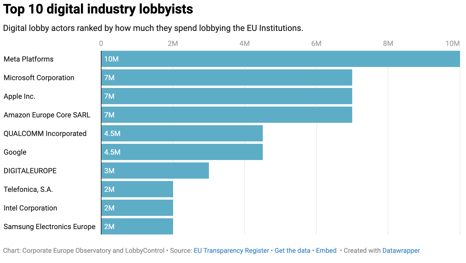 Von 2023 auf 2025 haben sich die Ausgaben der Digitalkonzerne für Lobbyarbeit von 113 Millionen auf 151 Millionen Euro deutlich erhöht. Einige Unternehmen investieren nun weit mehr Geld in Lobbying als vor zwei Jahren, darunter etwa Amazon (+4.275.000 Euro) sowie Meta und Microsoft mit einem Plus von jeweils 2 Millionen Euro. Meta liegt derzeit bei insgesamt 10 Millionen Euro – so viel gibt kein anderes Unternehmen für Lobbying in der EU aus. Was die Digitalbranche anbelangt, teilen sich Apple, Microsoft und Amazon den zweiten Platz mit jeweils 7 Millionen Euro.